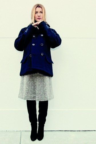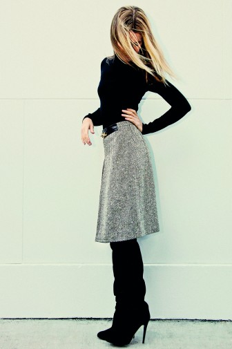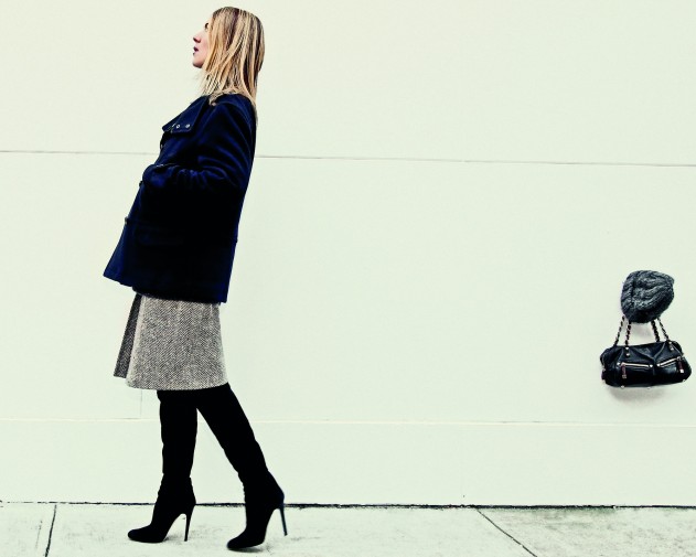 Vintage, tweed skirt by Celine (at Palm Beach Vintage); Skinny, black turtleneck sweater by Massimo Dutti; Black suede ‘Titan’ over-the-knee boots by Jimmy Choo; Oversized wool cardigan by United Bamboo; My old classic bag by Gucci; Grey wool hat by Eugenia Kim; Navy wool men’s coat by DKNY Jeans (Hey Shaun, you left your jacket in my house!!).