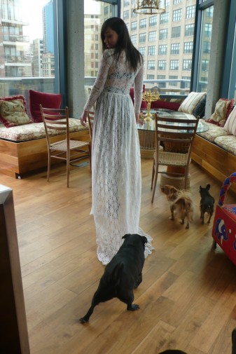 While we ride up the elevator to her Greenwich Village penthouse apartment, Fabiola warns me: “Savannah has a metal brace in his mouth. It looks a bit shocking. He got shot in the face by his previous owner.” Fabiola is referring to one of the four dogs she rescued. She found Van, as she likes to call the 4-year old black lab mix, while browsing petfinder.com. The poor dog had one hour before he would be put to sleep, horribly disfigured and devastated. So Fabiola intervened, adopted the pup and had him transported to New York. The same fortunate fate was bestowed upon two cheerful chihuahuas and a 13-year old retired black pug that loyally follow her every move.