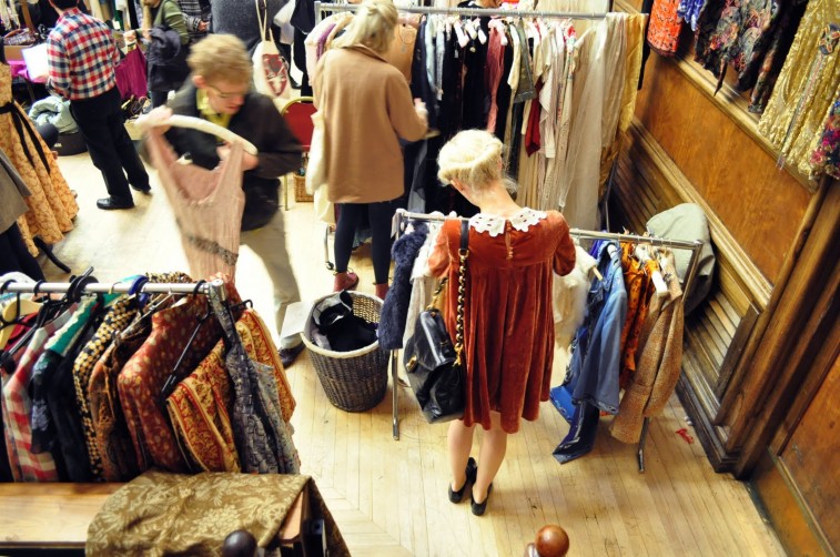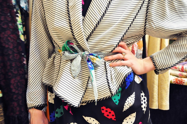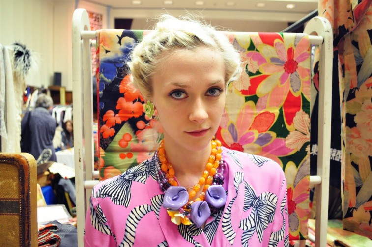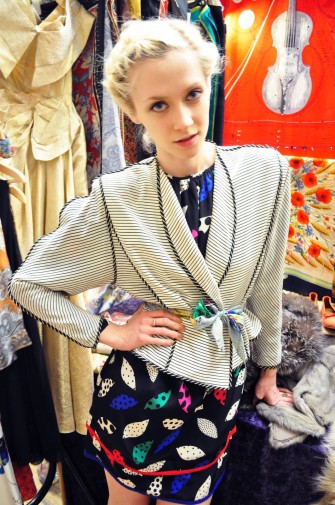 No matter how good my intentions or camera angles, shooting at an indoor vintage fair is not a walk in the park. The lighting is usually a cold, flat halogen. The backdrops are messy and busy – not an inch of empty white wall space. Shoppers run in and out of the shots. And there’s dozens of vendors to whom I have to rehash my story – “Hi, I have a blog about vintage. Can I take a picture of this dress on my muse?” – each time I find something interesting to shoot at their stall. It’s a lot of talking, a lot of waiting, and a lot of hoping that they will eventually let you take the shot. Oh yes, I get the door slammed in my face sometimes. Not everyone is taken in by this whole blogging business… Ouch. On the other hand, vintage fairs convene the hottest dealers from across the country so you get a concise overview of some of the best collections out there. Everyone wants to put their best foot forward and brings their prize pieces. Which, I must admit, can be stressful too. Given the limited time I have with my model, entering these massive venues can be overwhelming. I usually need a few trials and errors to get a hold on the right vibe and direction. And I mean, literally direction: where to start, how to walk? Some simple breathing exercises and a pat on the back from a beautiful, inspiring girl luckily always sort me out.