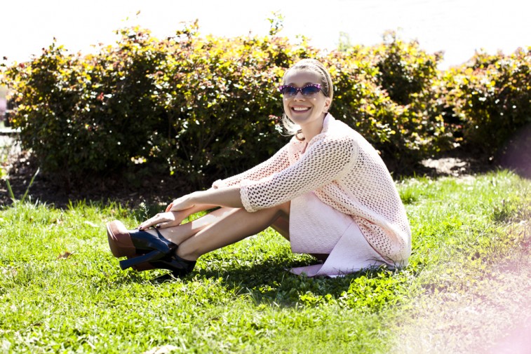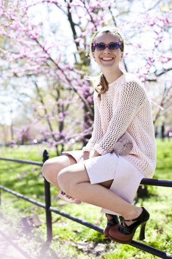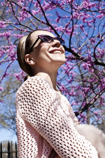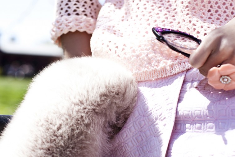 Yellow is not all it’s cracked up to be. I mean, who looks good in yellow? Peeps and little chicks maybe. And daffodils. But dresses and pants? When was the last time you heard about yellow being “the new black”? Like, NEVER! I vote for pink as the new Easter color. Just look at the bunny, with its cute ears and fluffy paws. It’s a hopping vision of spring and loveliness. And the blossoms! They may have come out freakishly early this year, but I don’t hear anyone complaining. I adore pink. It’s 100% responsible for my rose-tinted look on life and this new outfit: dress by No.21, sweater by Topshop, shoes by Prada (FW12), fur collar by Adrienne Lau, sunglasses by Sonia Rykiel and ring from a vintage market. I don’t know about you but I got a little bit of a tan this weekend. And guess what: it looks great with pink!