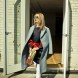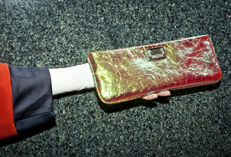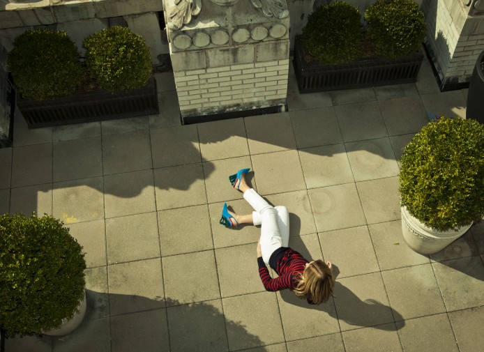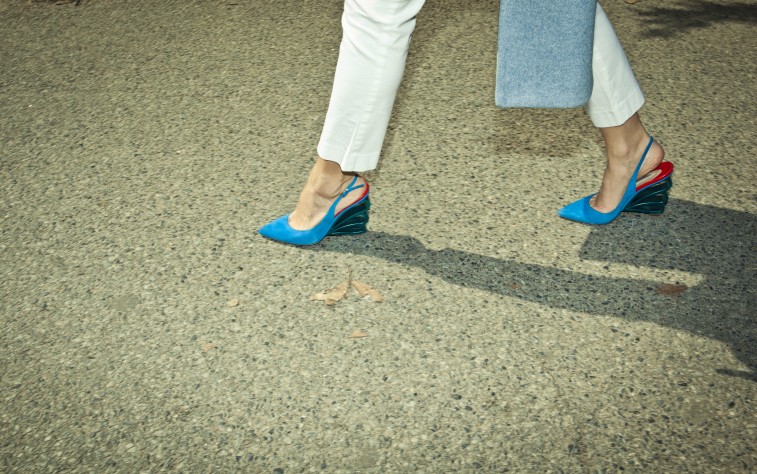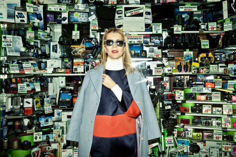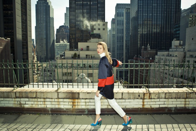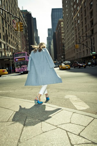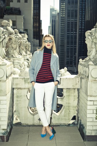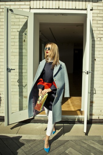 White crop pants and navy/red striped turtleneck by J.Crew; Navy and red dress by Paule Ka; Vintage powder blue coat by Celine; White turtleneck body suit by Wolford; Turquoise suede slingbacks by Nicholas Kirkwood; Metallic green bag by Corto Moltedo; Mirrored sunglasses by Sheriff & Cherry.