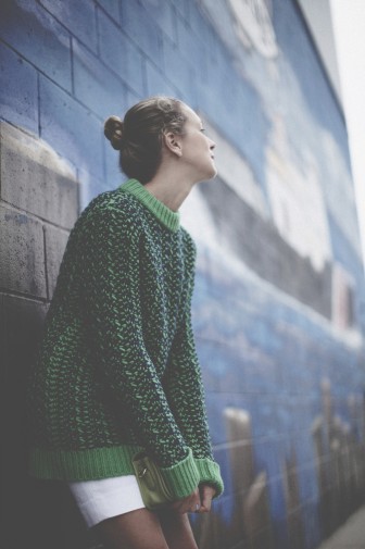 It’s really rare you find vintage shoes that fit well, and have a current look to them. I never look for, nor buy vintage shoes. They look odd. The heels are wrong. They’re narrow. And the idea of wearing someone else’s shoes is not exactly appealing. But on my last trip to Belgium I came across this pair of yellow and navy 60s loafers. They’re snug but comfortable and they look so cute! They’re a little hard to match with contemporary clothes, also because they’re not particularly flattering on the legs, but I think I did a good job with the structured white and bright green. I designed the dress myself, about 2 years ago, and it seems actual now because of all the peplum we’re seeing this season. And the sweater, oh that sweater! I’m head over heels with it….