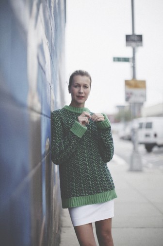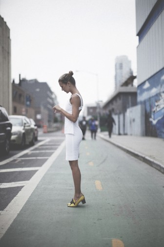 Wool sweater by Jil Sander; white cotton dress by Natalie Joos; vintage 60s yellow and navy shoes from Olga’s Retro in Gent (Belgium); bag by Coach; gel nails by Primp & Polish.