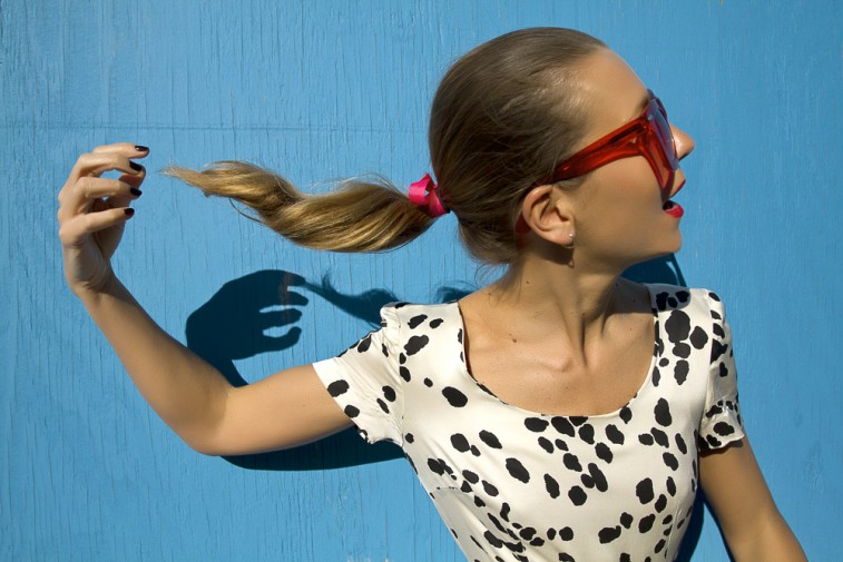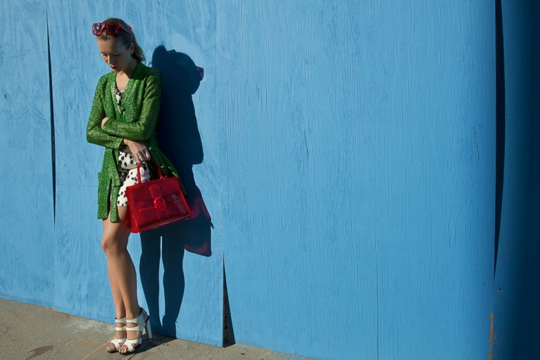 I will say it again: PLEASE have some fun with fashion. I swear this kind of shoot makes me ecstatic! I don’t know if I’ve ever met a photographer with this much imagination, and entertaining at that. Thierry Van Biesen, a Belgian/Lebanese photographer who lives in my neighborhood, actually dreams about his scenarios. They bubble up in his head like mushrooms while he’s sleeping and voila! All I told him was that I would be wearing the vinyl Delvaux Brillant in Chaperon Rouge and theĀ plexi Red Status Grey Ant sunglasses (perfect match I ask?) and he came up with this funny loop sequence! The silk dalmatian print (or is it a small cow?) dress and lurex green cardigan (it’s the buttons that did it for me) are vintage and the sandals are my all time favorite Pierre Hardy’s.