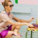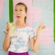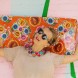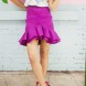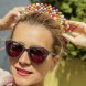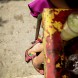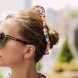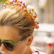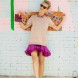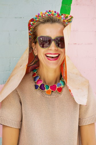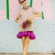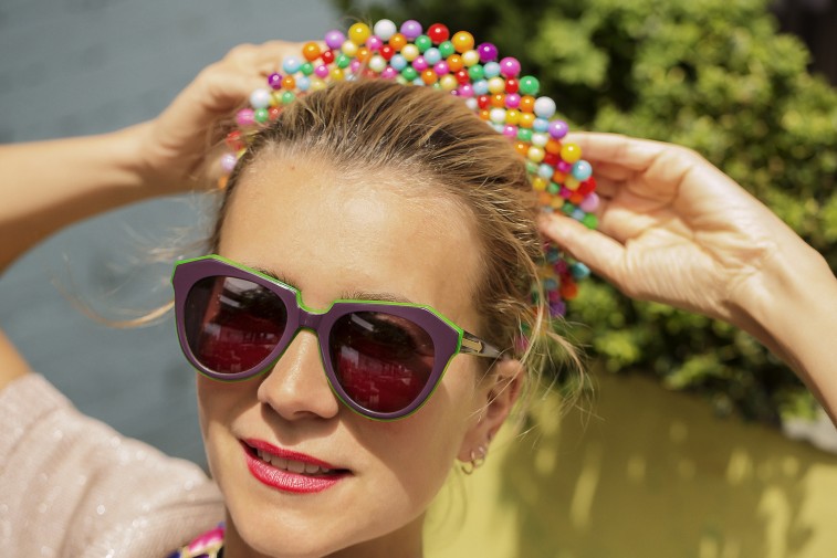 Vintage purple ruffle skirt by Yves Saint Laurent; Gold knit T-shirt by Peter Som; Vintage cloud T-shirt by American Apparel; Multi-color, beaded clutch and necklace worn as headpiece by Delduca; Multi-color, embroidered pumps with pom poms by Caroline Issa for L.K. Bennett; Hearts necklace by Sophia 203; Purple and green ‘Number One’ sunglasses by Karen Walker.