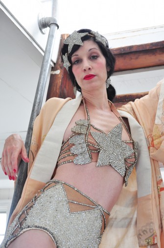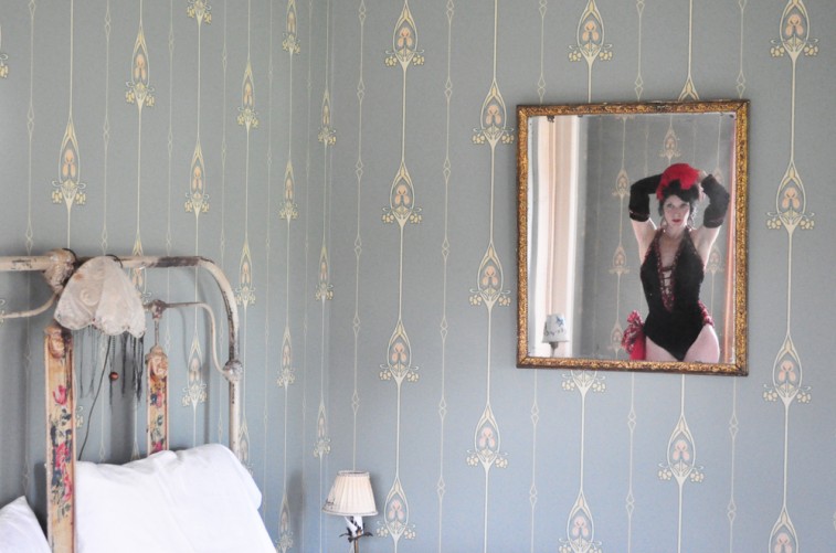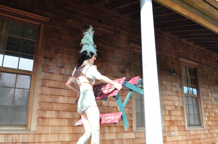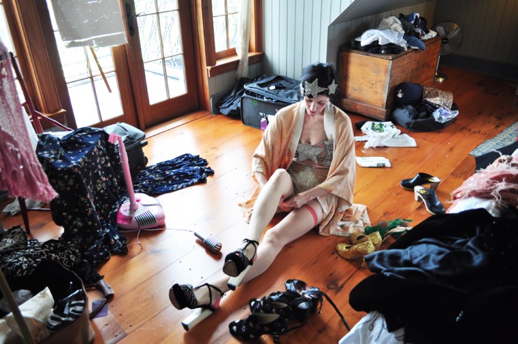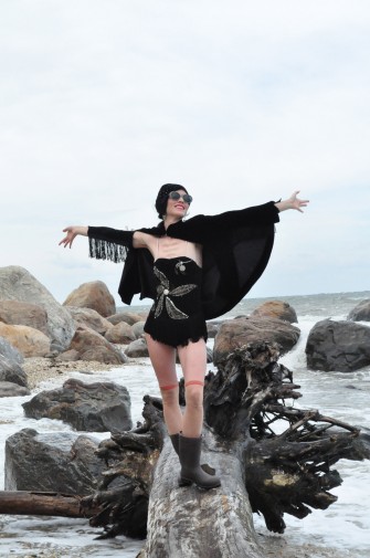 We came up with the idea for our shoot while vintage shopping in Los Angeles this summer. We would take a trip to the North Fork of Long Island and shoot all the showgirl costumes she’s been collecting since high school in San Francisco. “A lot of my friends worked at The Wasteland on Haight Street. That place was a treasure trove and we had an all access pass. I also modeled for the store and had a crazy good discount. We were seriously dressed to the nines all the time! Now, I find most of my costumes around Halloween in vintage stores or on the internet. I went to law school – I never took the bar – but I learned how to be a mean researcher. Thanks to law school I can find anything online!” We made an entire weekend of it, with farmer’s market food, cups of tea, invigorating walks and endlessly entertaining talks. Sarah Sophie dragged a suitcase full of vintage leotards, feather head dresses and sequined costumes to the island and prepared all the looks in a matter of minutes. We spent hours darting around, from the beach to the top of the roof, creating her story. It was endearing to see her eyes light up each time she picked up a new costume and she’d say: “These things make me crazy happy.”