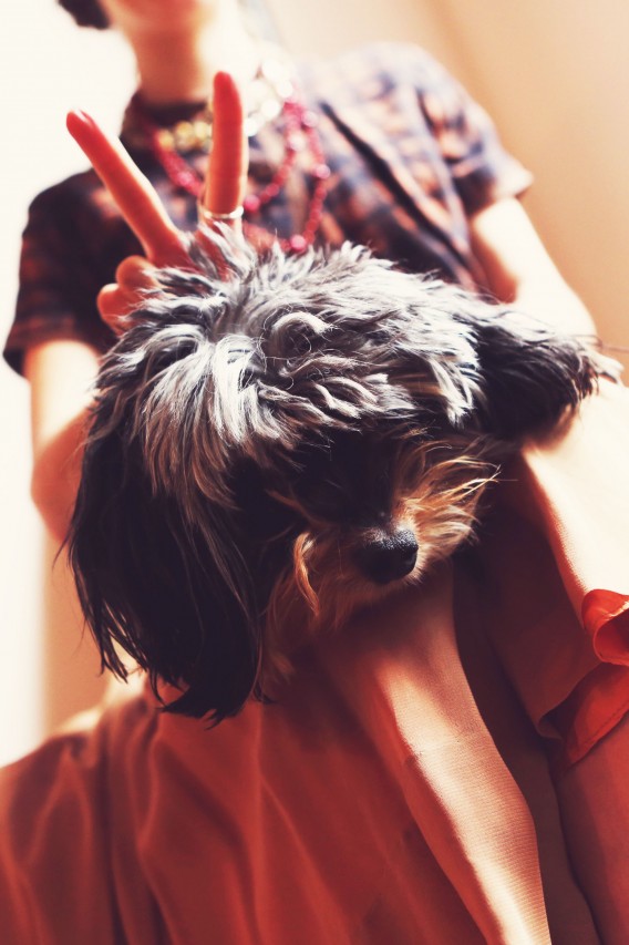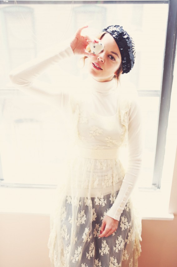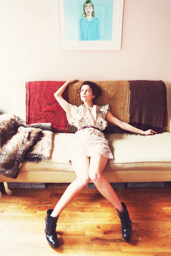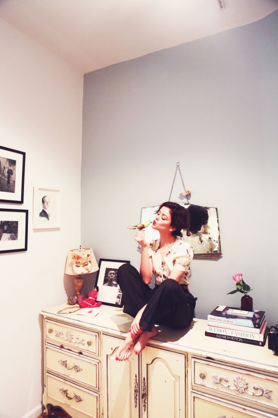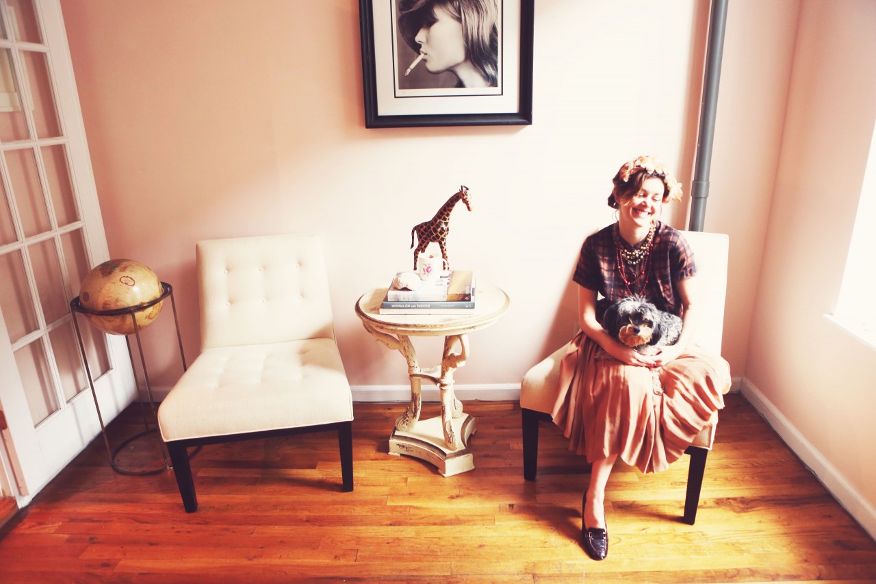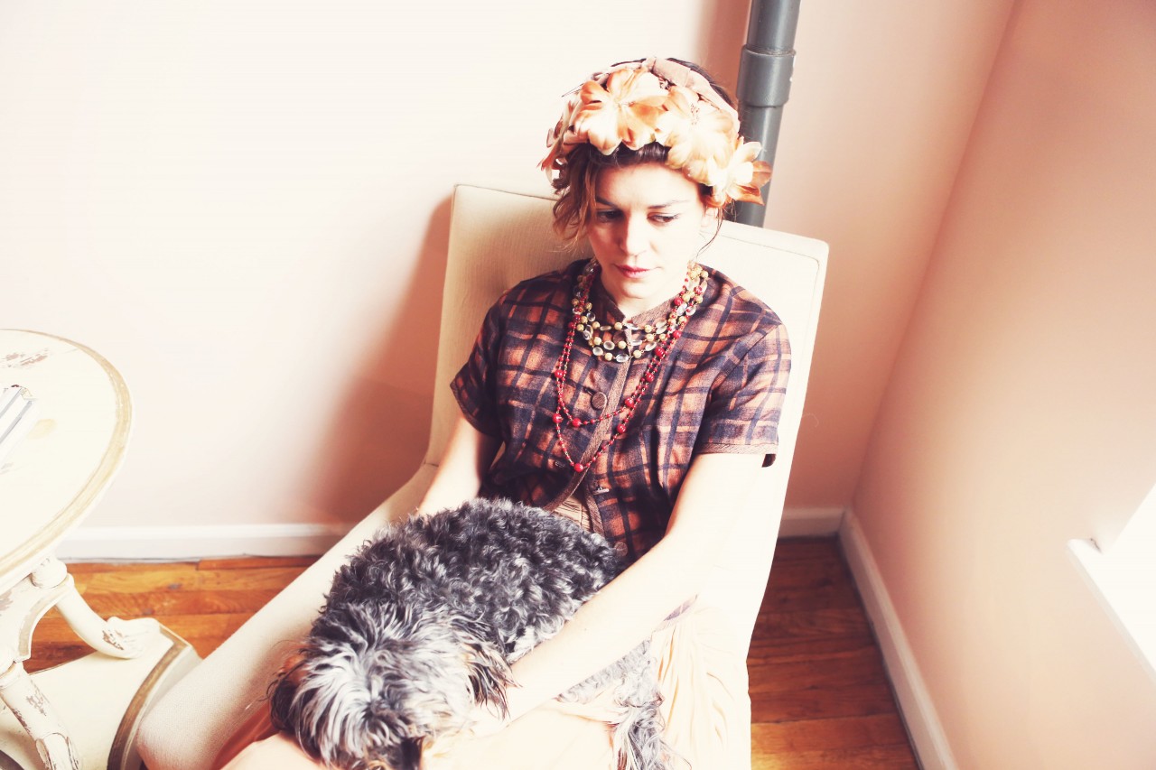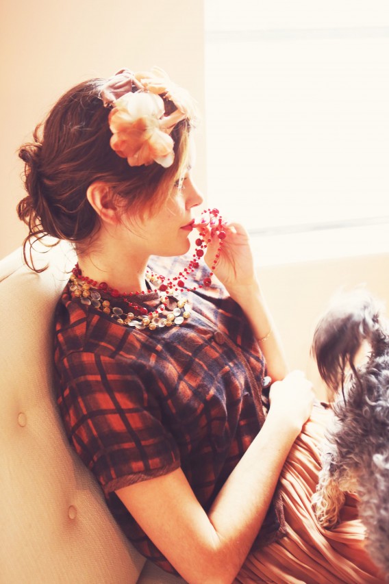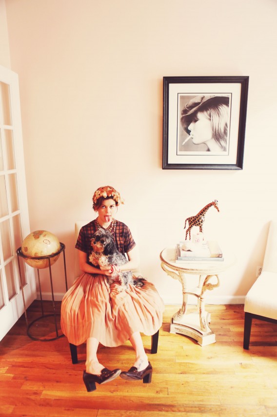 Nora Zehetner lives in the East Village. The last time I was in her walk-up apartment I fitted her for Katie Ermilio’s video look book shoot. She wore pastel pink satin gowns for spring and darted through the streets of Williamsburg like a character in a Jacques Tati comedie. Today we’re talking vintage and it’s freezing outside and we can’t find the mascara. But the tan little poodle puppy is practically in the same spot, protective and loyal, jumping from her basket to Nora’s lap and back. Ellie has been blind since birth – Nora got her when she was just one – but both girls have found perfect living symbiosis. “We never knew each other any other way. She’s super tough – absolutely fearless- it’s very inspiring. But I do have to be careful not to move furniture around or leave things on the floor because she memorizes the lay-out of the rooms and she is likely to trip over or run into things if they aren’t where she is used to them.” Nora’s clothes are stored in the bedroom. She doesn’t have much but every piece is meaningful: her grandmother’s jewelry, hats she bought and shipped from a small town near her mom’s house in Dallas, sweet designer dresses and shirts with bird prints. In fact, there are birds everywhere. “I love birds! I guess I had unconsciously been buying things with birds on them for years. And a few close friends call me Nora-bird and so they always buy me things with birds on them as well.”