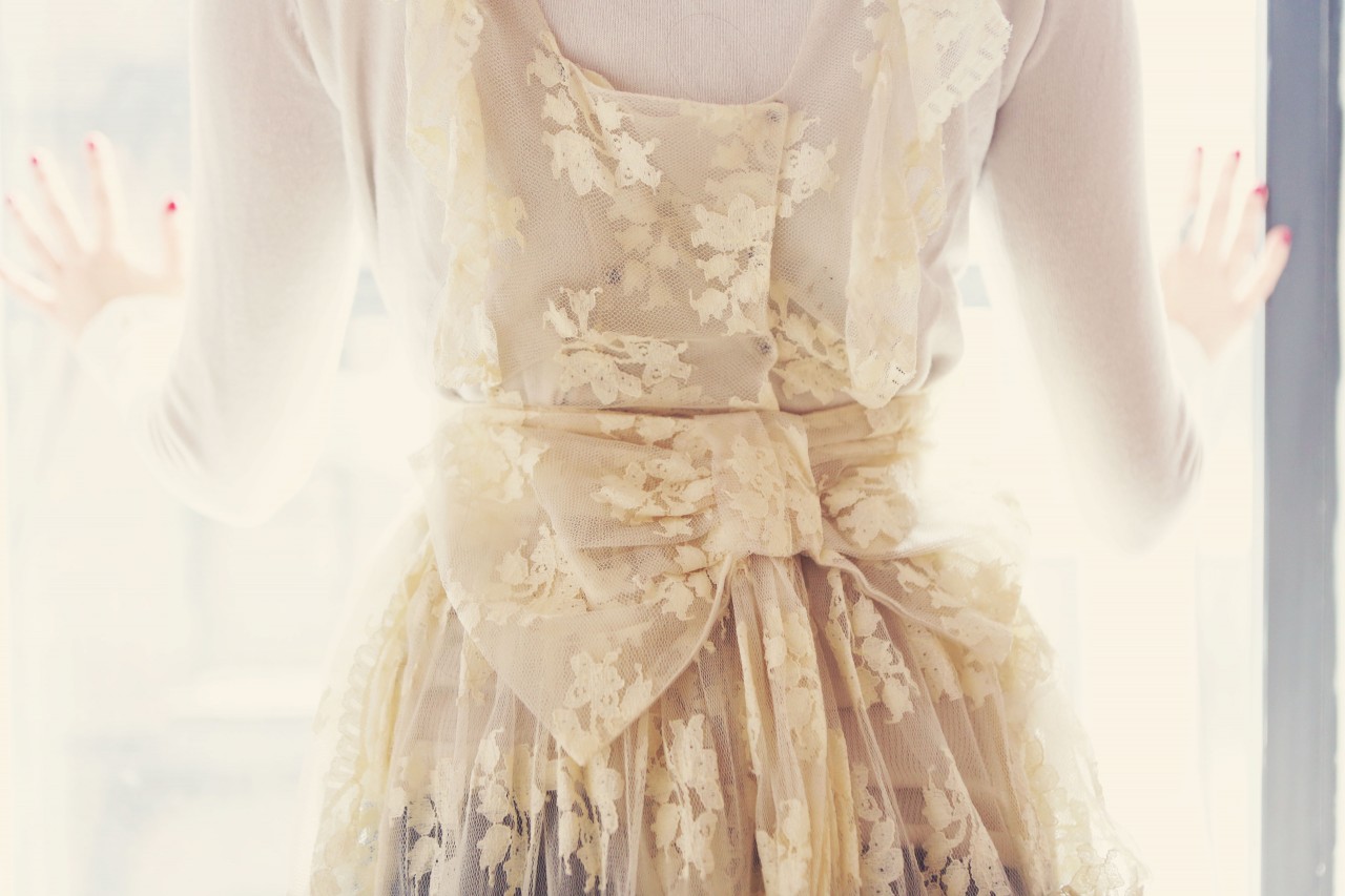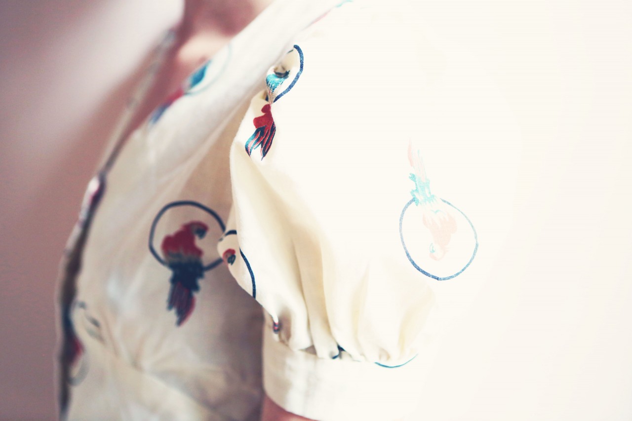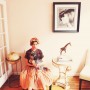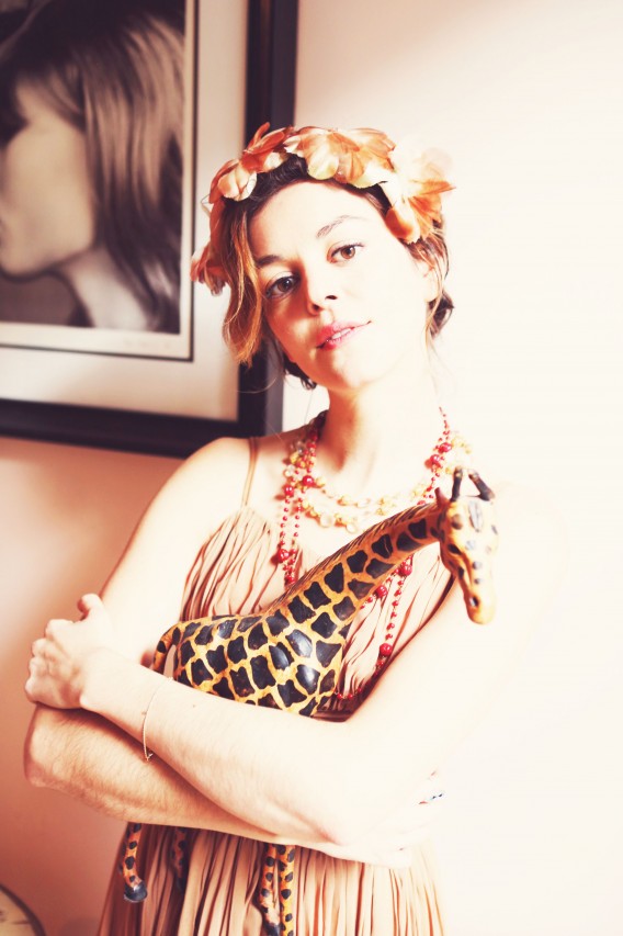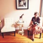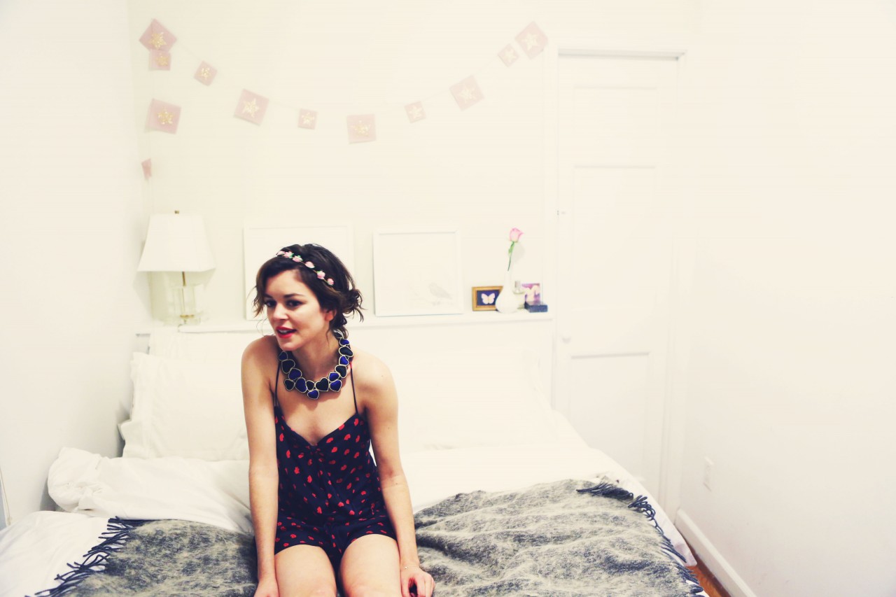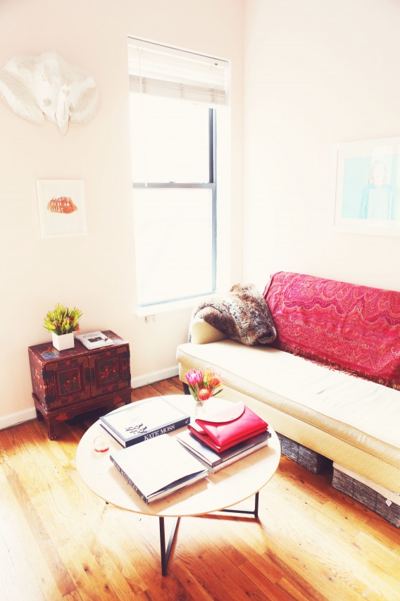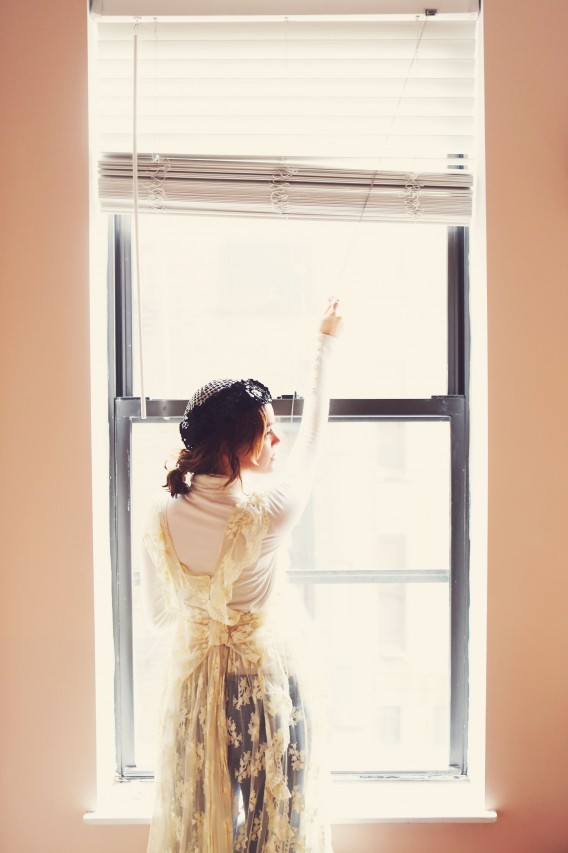 Nora Zehetner lives in the East Village. The last time I was in her walk-up apartment I fitted her for Katie Ermilio’s video look book shoot. She wore pastel pink satin gowns for spring and darted through the streets of Williamsburg like a character in a Jacques Tati comedie. Today we’re talking vintage and it’s freezing outside and we can’t find the mascara. But the tan little poodle puppy is practically in the same spot, protective and loyal, jumping from her basket to Nora’s lap and back. Ellie has been blind since birth – Nora got her when she was just one – but both girls have found perfect living symbiosis. “We never knew each other any other way. She’s super tough – absolutely fearless- it’s very inspiring. But I do have to be careful not to move furniture around or leave things on the floor because she memorizes the lay-out of the rooms and she is likely to trip over or run into things if they aren’t where she is used to them.” Nora’s clothes are stored in the bedroom. She doesn’t have much but every piece is meaningful: her grandmother’s jewelry, hats she bought and shipped from a small town near her mom’s house in Dallas, sweet designer dresses and shirts with bird prints. In fact, there are birds everywhere. “I love birds! I guess I had unconsciously been buying things with birds on them for years. And a few close friends call me Nora-bird and so they always buy me things with birds on them as well.”