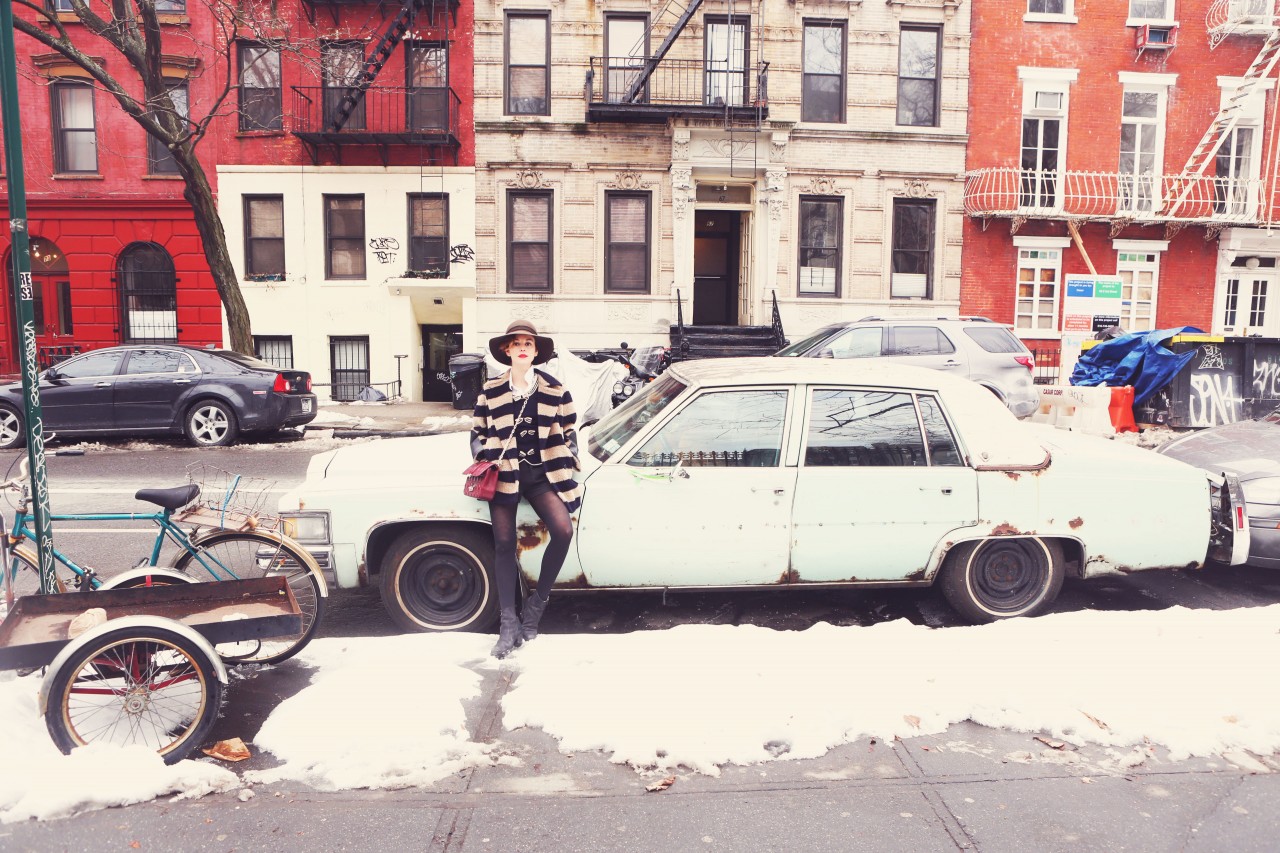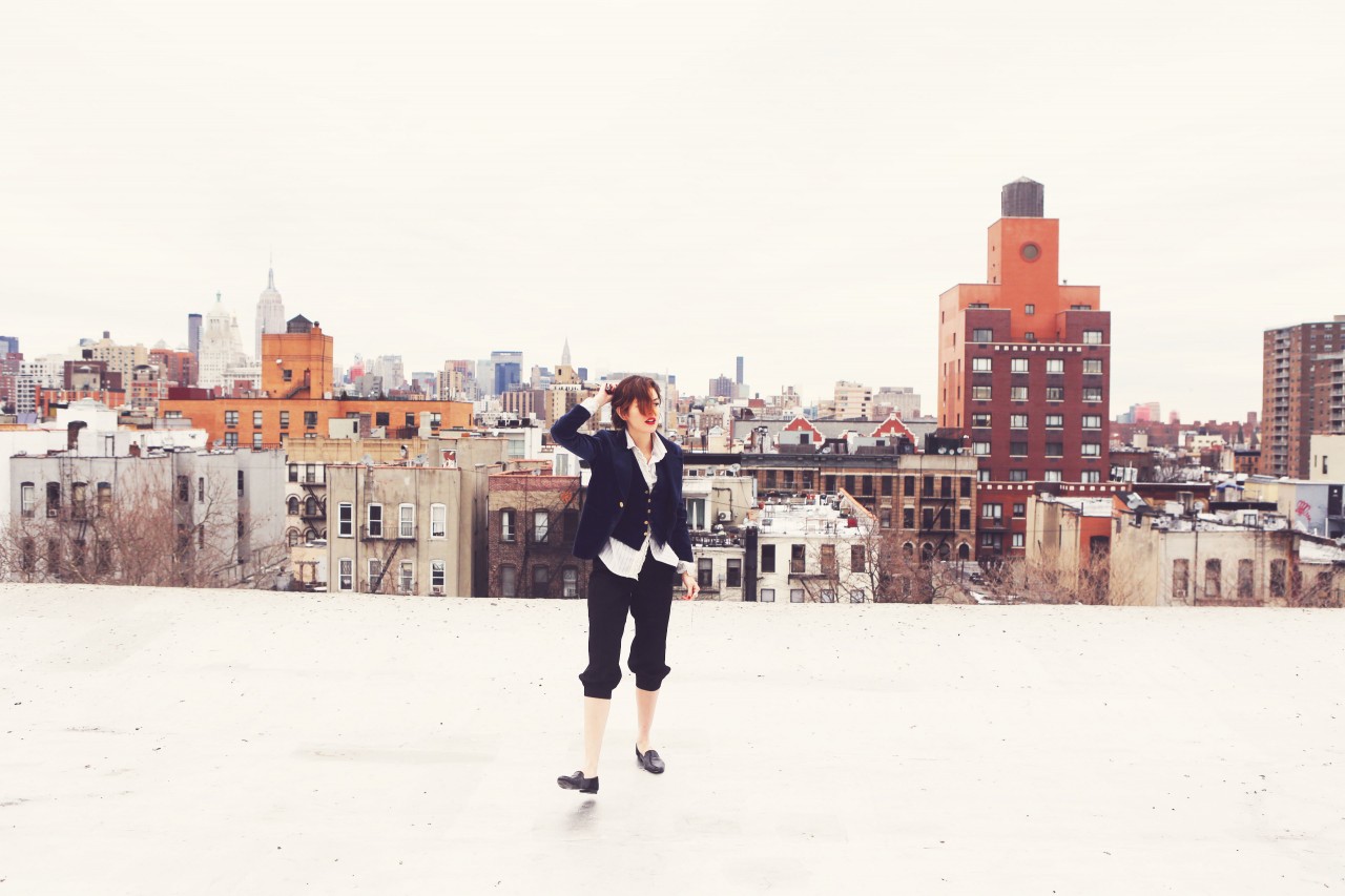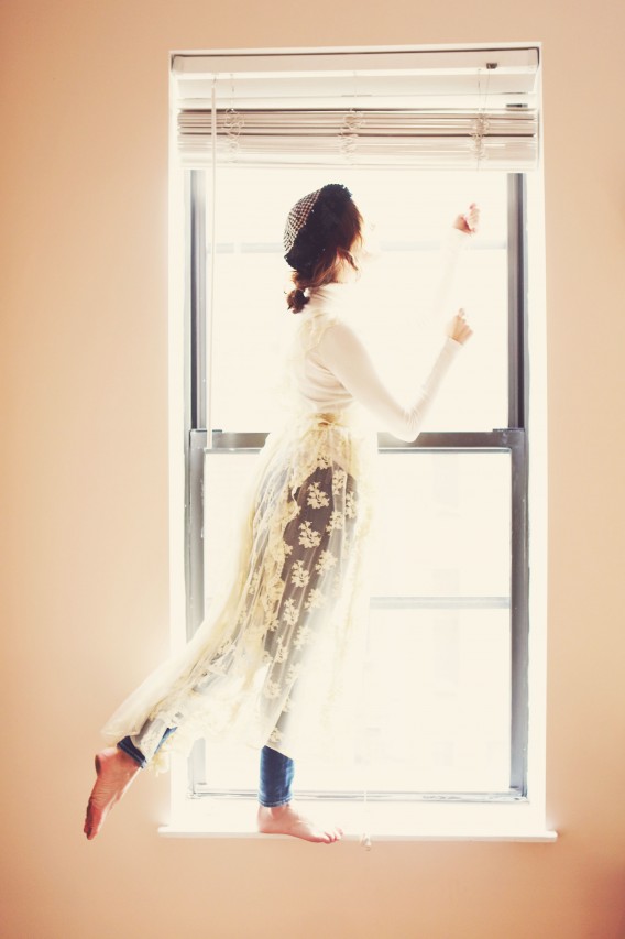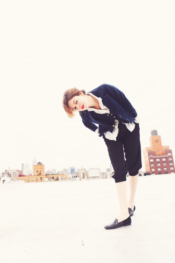As the day goes on, I discover a Nora who’s consciously reserved but purposely outgoing. She’s serious by nature but knows how to mandate a youthful, assembled spirit. She pulls funny faces, climbs furniture, smiles mischievously, dances like a page boy, and gets into girlie retro character. Though her self-proclaimed clumsiness is somewhat surprising, everything makes perfect sense. She’s not snooty, or crazy, she’s a creative East Village girl who lives a quiet, soul-searching life and loves to make breakfast. “I think egg sandwiches are the greatest thing in the world!” she claims. “I think I have a million variations on the egg sandwich. But the basic one is just a fried egg with Parmesan, open-faced on sourdough bread with mustard and cornichons. I love pickles and vinegary things. I pretty much eat like a pregnant woman always.” Gluttony aside, Nora is a pleasure. After a few changes she finds herself back in the bathroom, applying lipstick, when her tummy starts to rumble. “So silly I didn’t eat breakfast,” she complains. Maybe that’s why she’s can’t find her mascara this morning…? “Aaah, found it!!!” she cheers. And the picture is perfect.