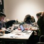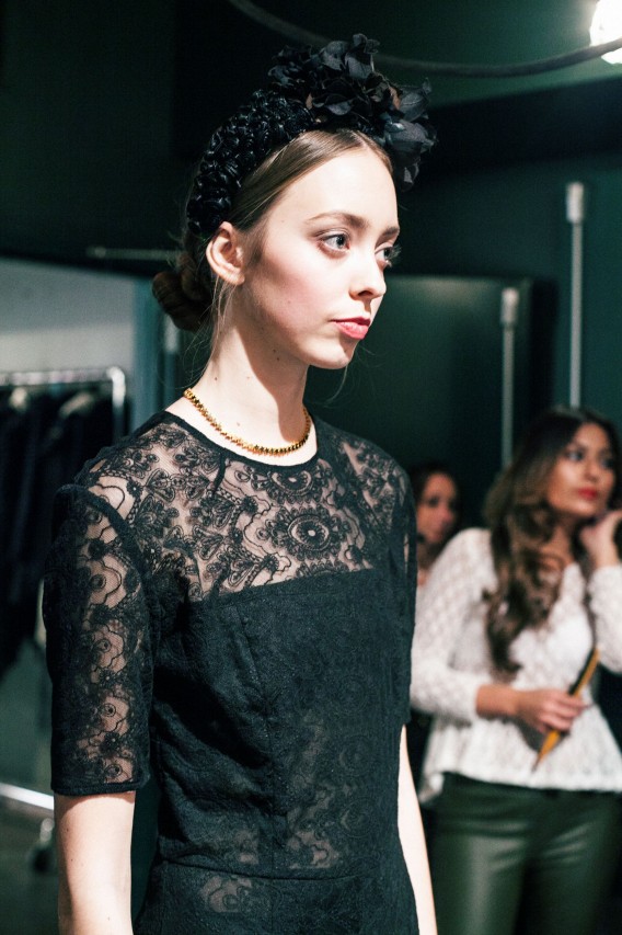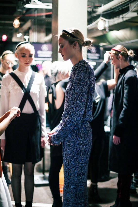 We spent one week in the studio, continuously casting, fitting, trying, refitting, cutting and sewing. The factory is just a few blocks away so each time a garment needed changes, an eager intern braved the snow and dropped off the alterations. Up until the very last day we came up with new linings and changed fabrics and looks. We collaborated with Tuleste on head bands and jewelry, Hue provided socks, Modern Vice the shoes and Yestadt Millinery made hats. Day of show everything went smoothly and the floor was packed! The show got great reviews and the fans…? They went home inspired.