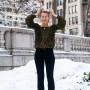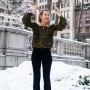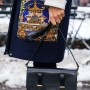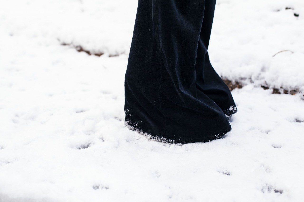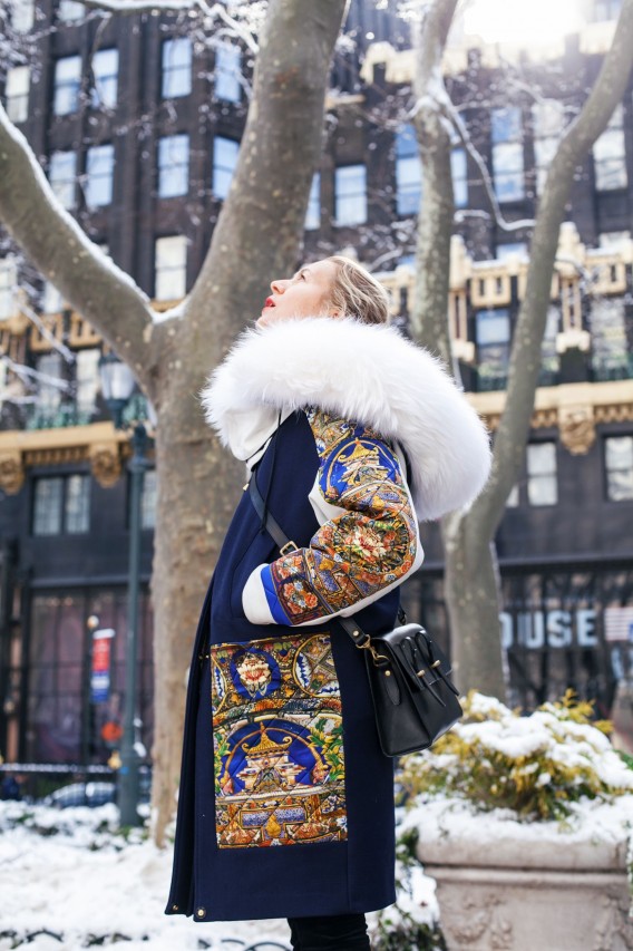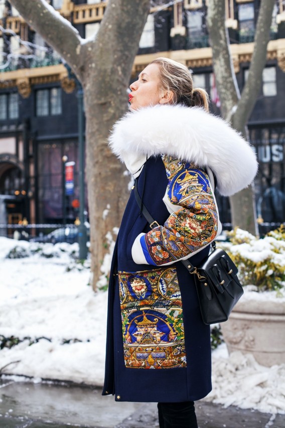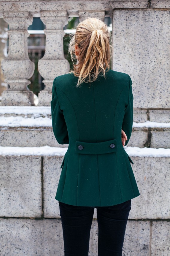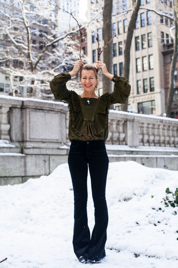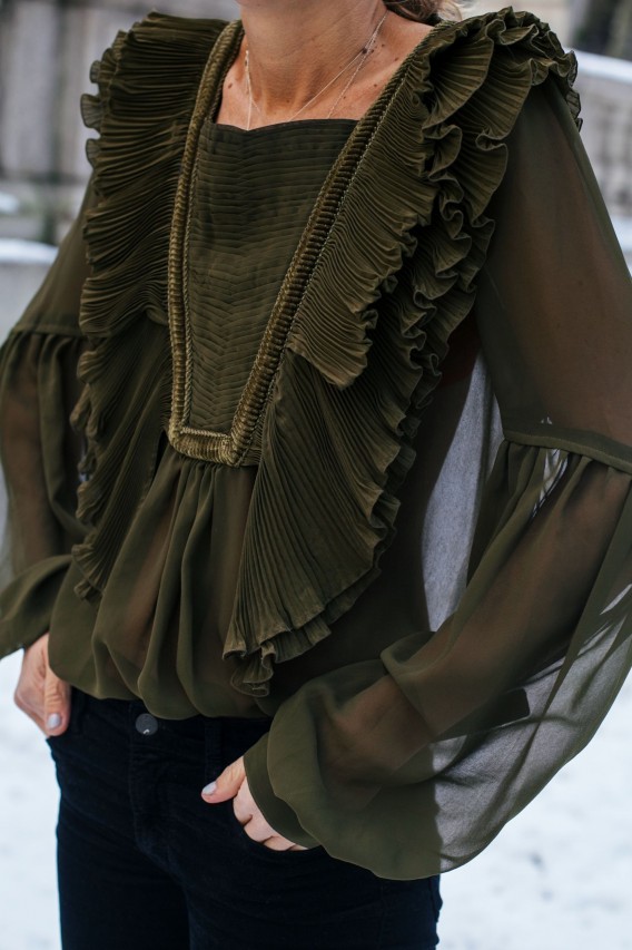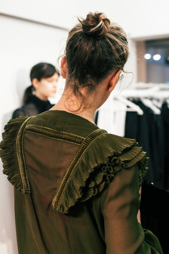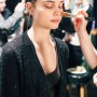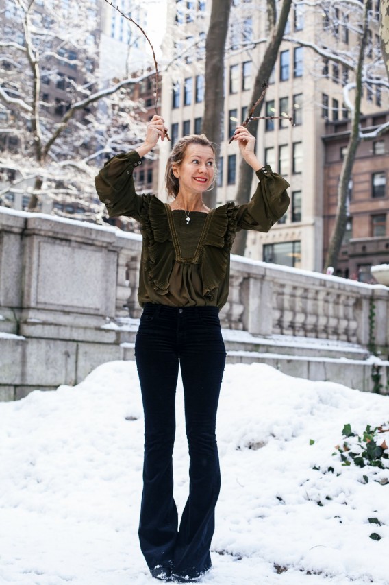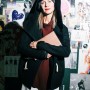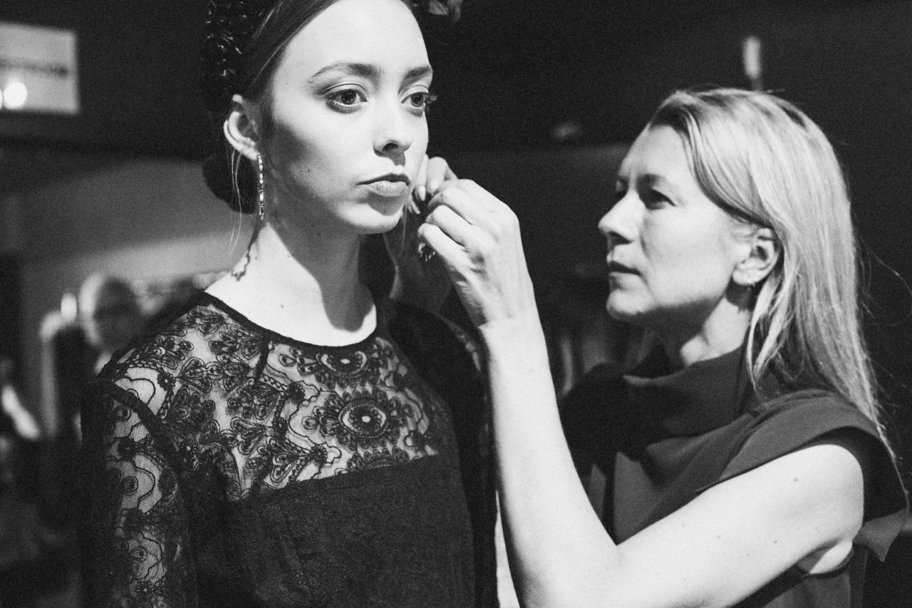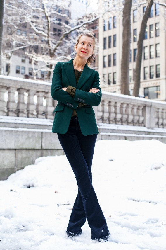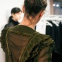 During preparations, I am wearing a vintage, army green chiffon shirt by Givenchy; Black velvet ‘Martini’ flare jeans by J Brand; Rubber platform boots by Burberry; Hunter green single breasted blazer by Moschino Couture; Eskimo hooded coat by Just Cavalli; Black ‘Le Bac’ satchel by United Bamboo.