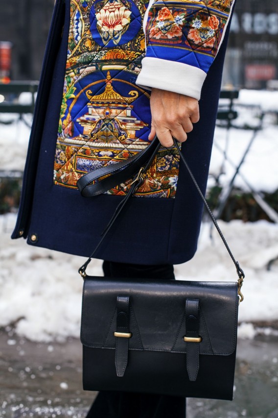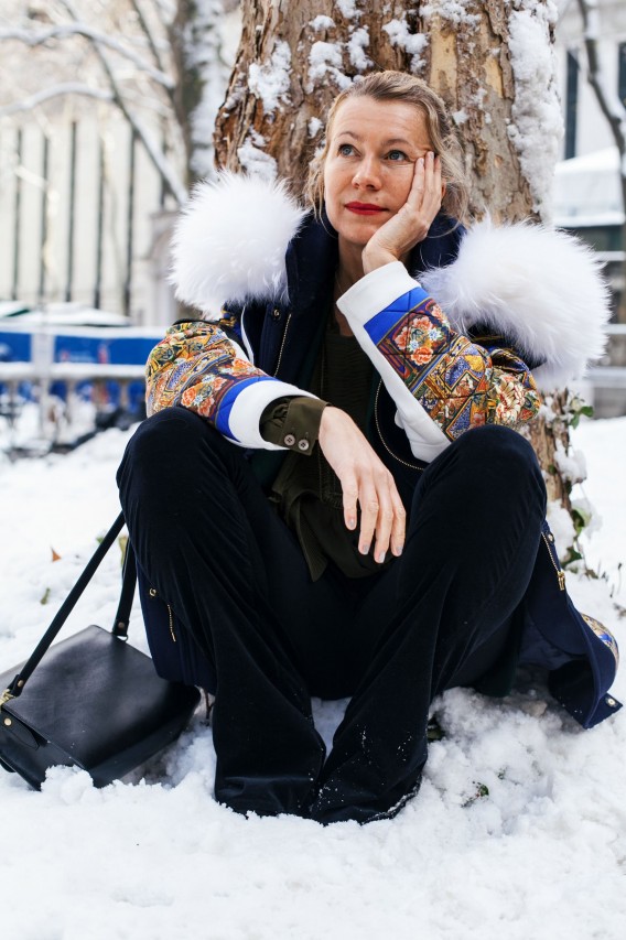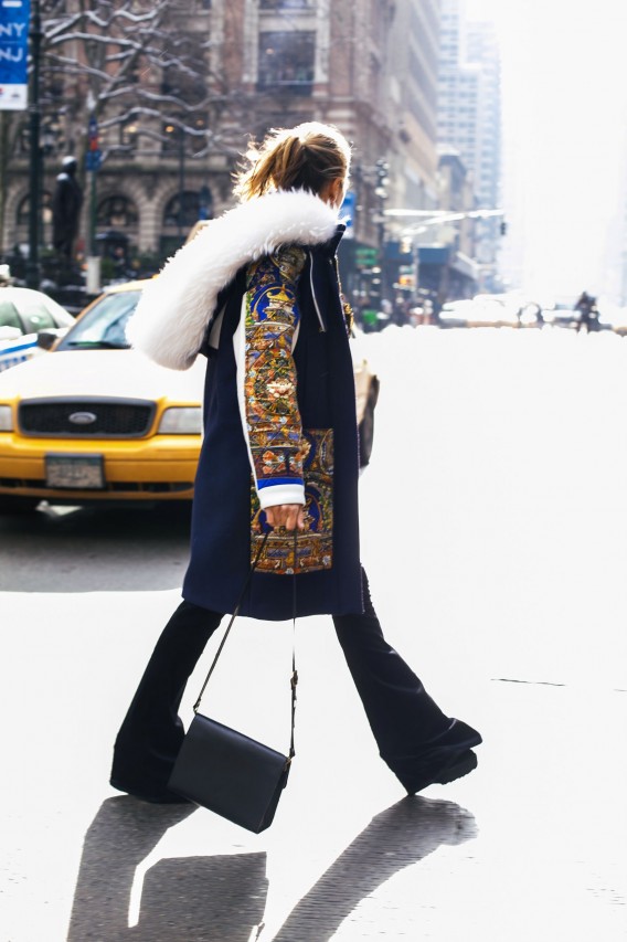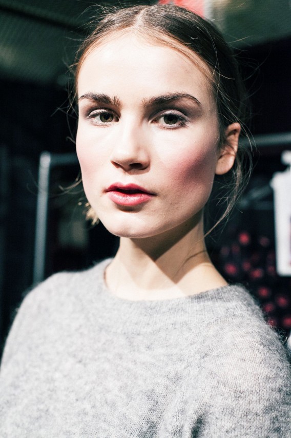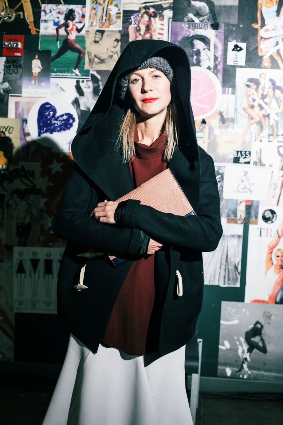 At the show I am wearing Burgundy top and cream skirt by Ellery (Pre-Fall 14); Burgundy suede ‘Delta’ boots by Jimmy Choo; Navy blue toggle jacket by Rick Owens; Grey wool hat by Eugenia Kim.