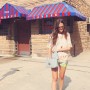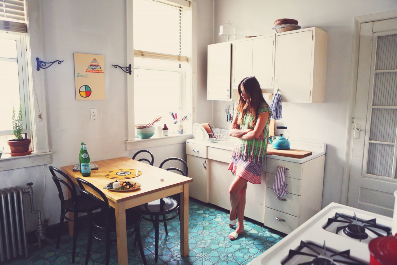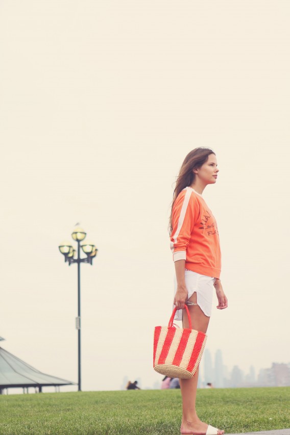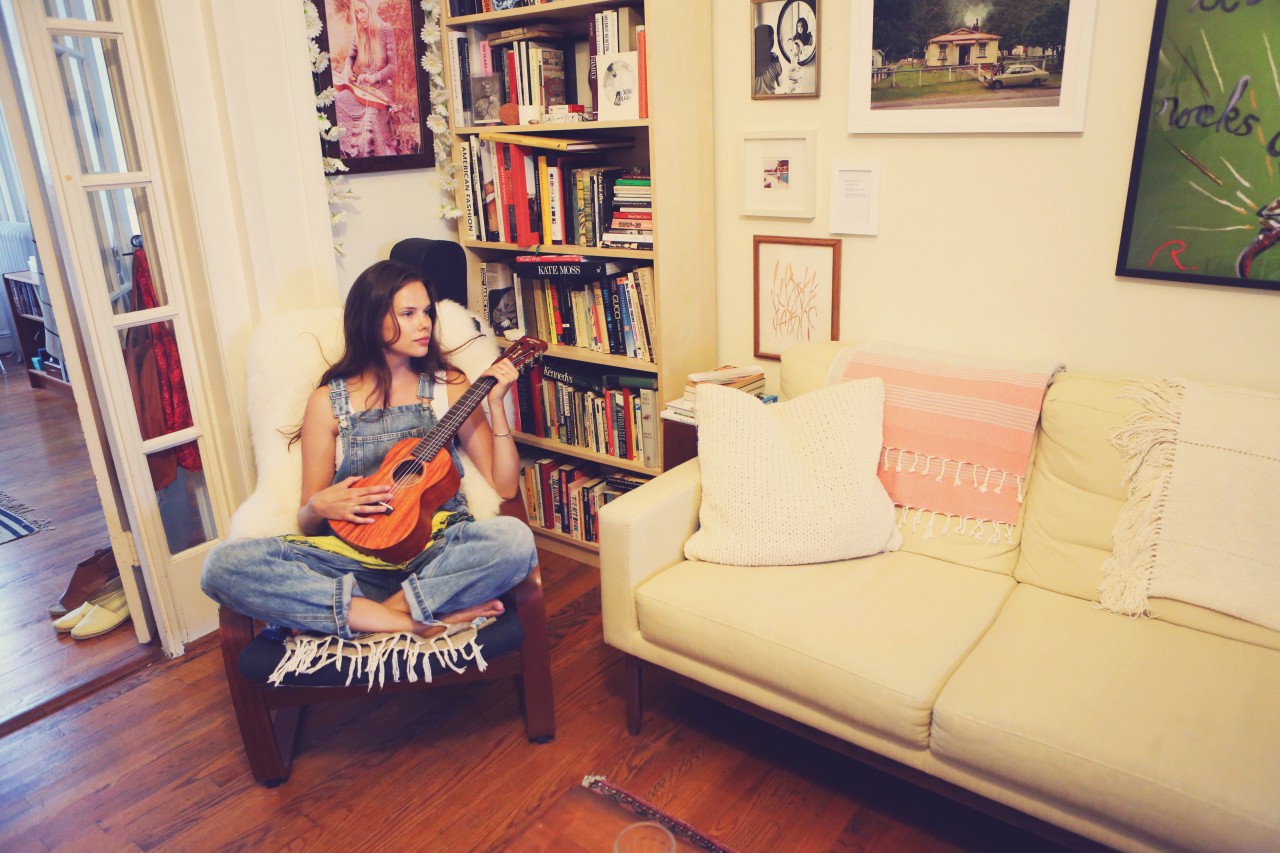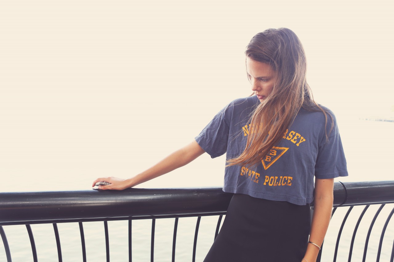 We never met before our shoot but we both feel at ease, even with the rush of humidity and afternoon heat slaying us like giants. Molly takes me around the corner to a creepy local bar, a busy public park and a walk along the boardwalk to the famous Lackawanna ferry terminal. “I just realized I have a lot of clothes that look like vintage,” she says when we head back up the stairs. “I truly am happiest at home in a robe, mumu or kaftan. Outside the house I try and maintain that same comfort level by wearing organic shapes and materials. I like clothes that feel lived in like a great pair of high waisted jeans or an easy dress. I always think of the Clueless quote: “I know it sounds mental but sometimes I have more fun vegging out than when I go partying. Maybe it’s because my party clothes are so binding.” There’s nothing binding about today. We talk about her amazing trip to the Amalfi Coast and sip Coca Cola to stay on our toes. Until the music stops. “Aha!” she lights up. “That means my husband is coming home. Because he kicked me off Spotify.”