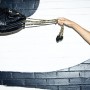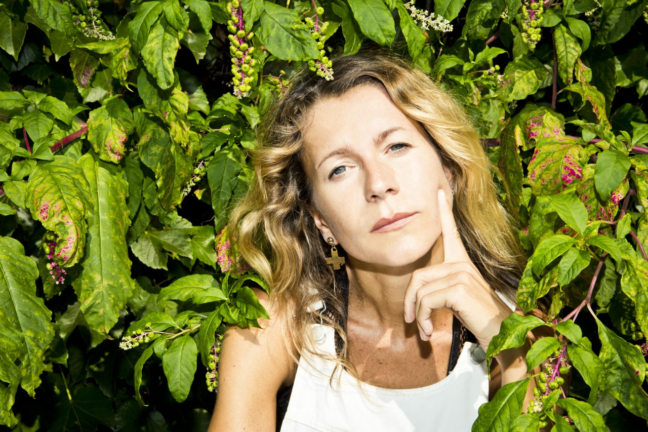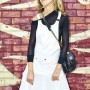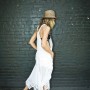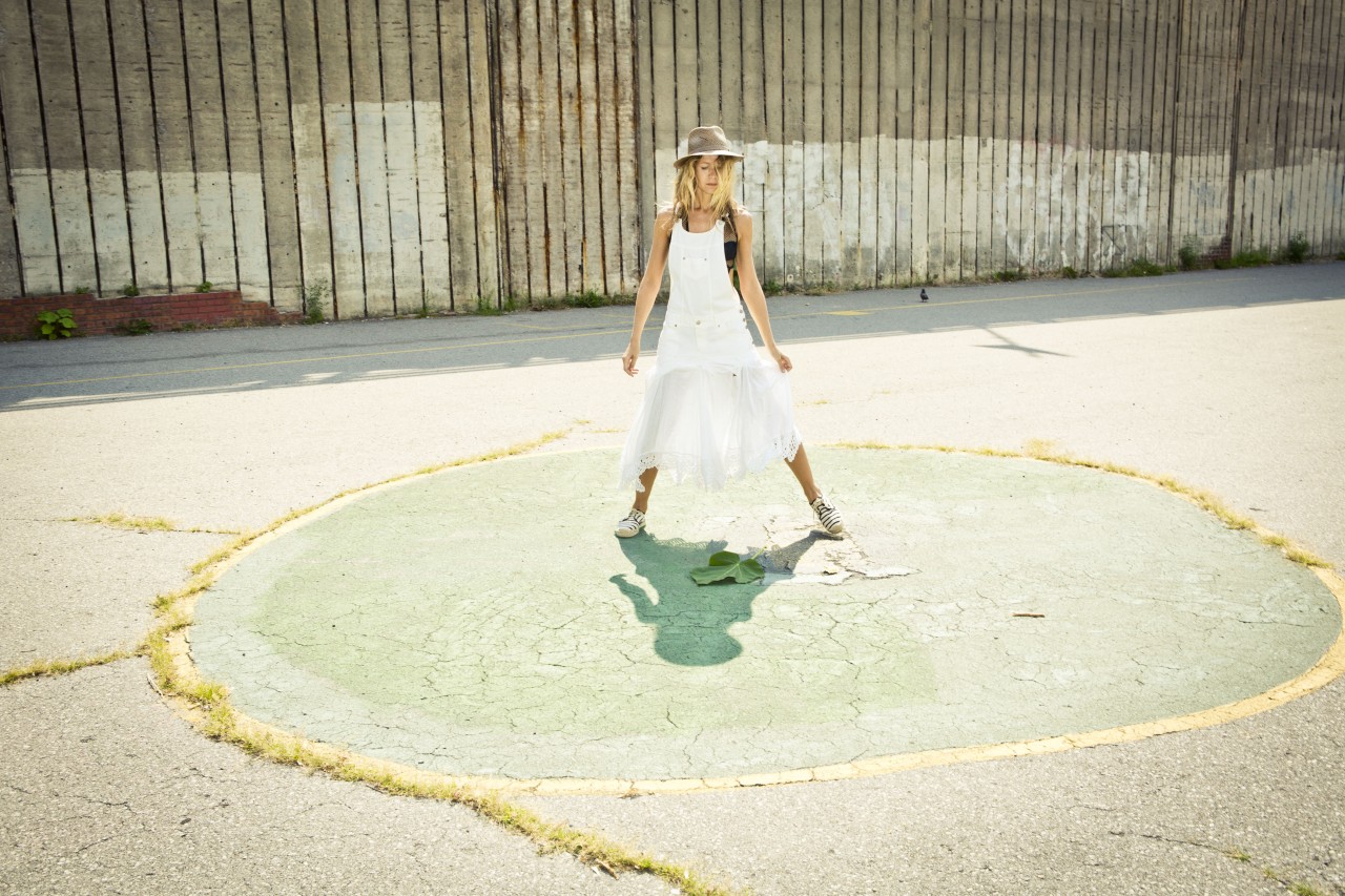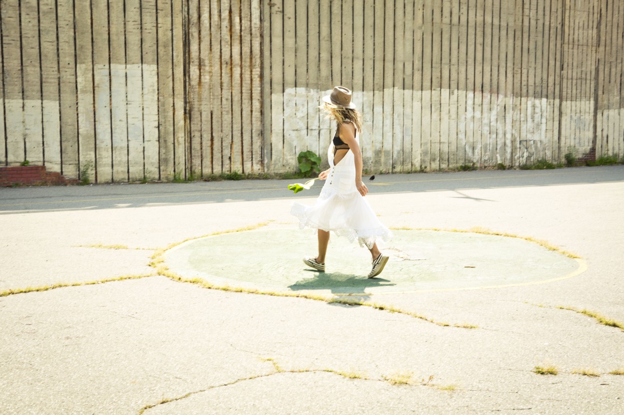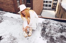 Vintage white denim and lace custom jumpsuit; Vintage black mesh bathing suit by Tsumori Chisato; Vintage black off-the-shoulder sweater by Alexander McQueen; Black leather knot skirt by Veronique Leroy; Striped platform espadrilles by Soludos; Vintage bucket bag by Chanel; Woven Panama Hat by Bailey of Hollywood; Black rubberized sunglasses by Kris Van Assche for Linda Farrow; Vintage gold cross earrings from Le Grand Strip.