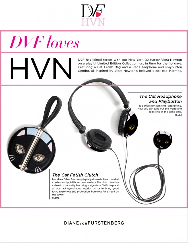 New York DJ Harley Viera-Newton and her by now infamous cat Marmite (featured here) have teamed up with Diane Von Furstenberg for a special holiday collaboration. Together they’ve created a bag and head phones inspired by Marmite, whiskers, ears and vicious snarl included. To celebrate the launch they recruited Aram Bedrossian and I to produce a festive video. We based the story on the party scene from Breakfast at Tiffany’s at Holly’s teeny apartment. But rather than look for a wealthy husband, we have Harley searching high and low for Marmite, who’s lost in sea of legs and confetti…