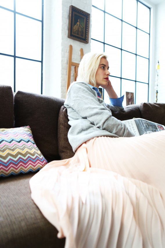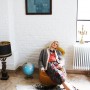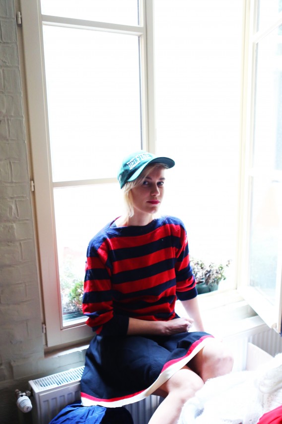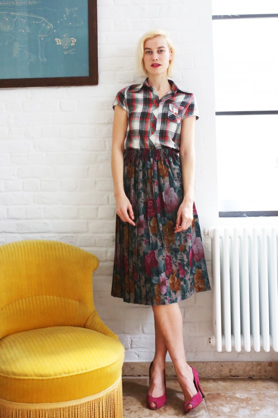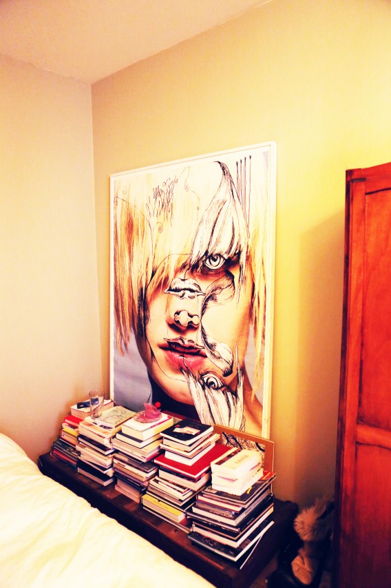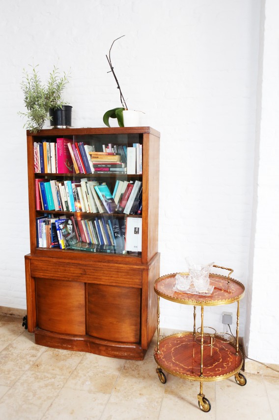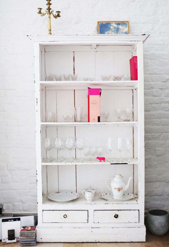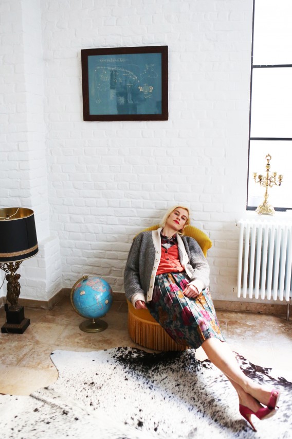 She hasn’t quite unpacked yet. The furniture in the living room looks settled and the cupboards in the kitchen are full but the bedroom is chaos, albeit organized. “I don’t know if I will find all my vintage,” she apologizes. “A lot of my clothes are still in boxes.” She tries the wardrobe first. The mechanism of the doors must have given way a long time ago – perhaps during the move – because they are held shut by a rather primordial yet effective sliding concoction. “I have to fix this,” she says as she swiftly drops the stick to the floor and we watch how the doors hinge forward. All in due time I’m sure. It’s only been a few months since Delfine sold her big house and found smaller, more appropriate quarters for a single girl. “Just when I moved in here, I got back with my ex-boyfriend and now it’s too small!” she laughs. “But it’s OK. We’re happy here.”