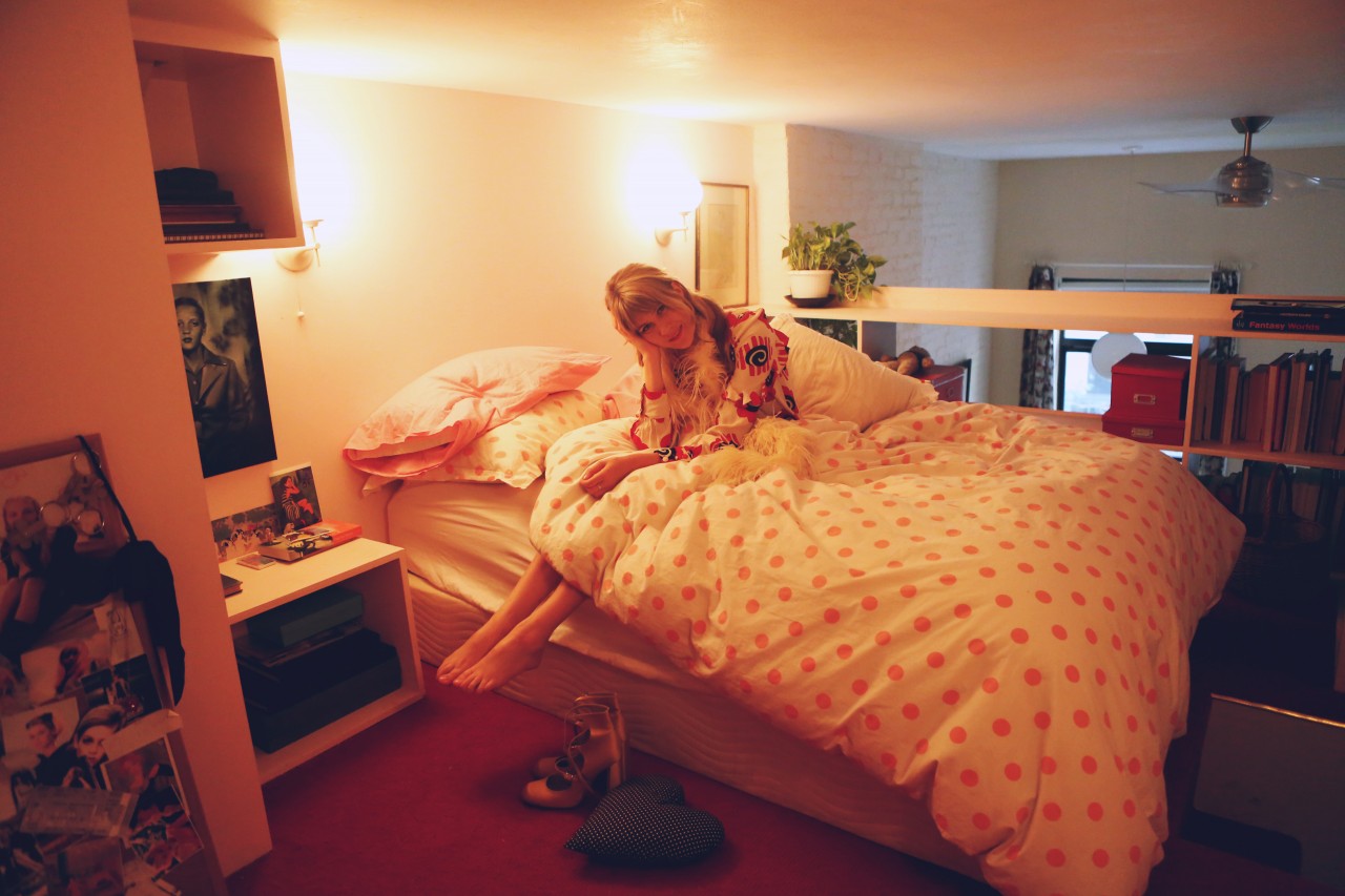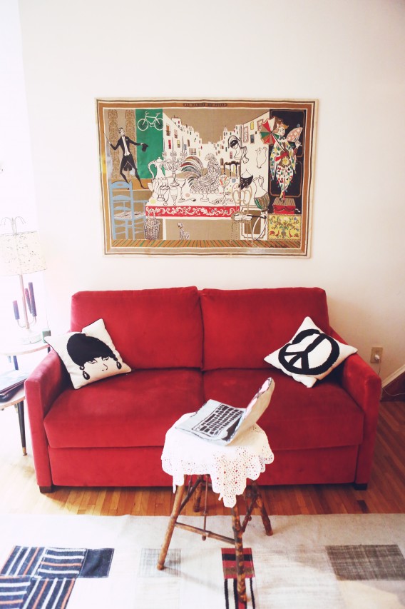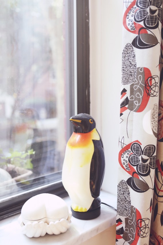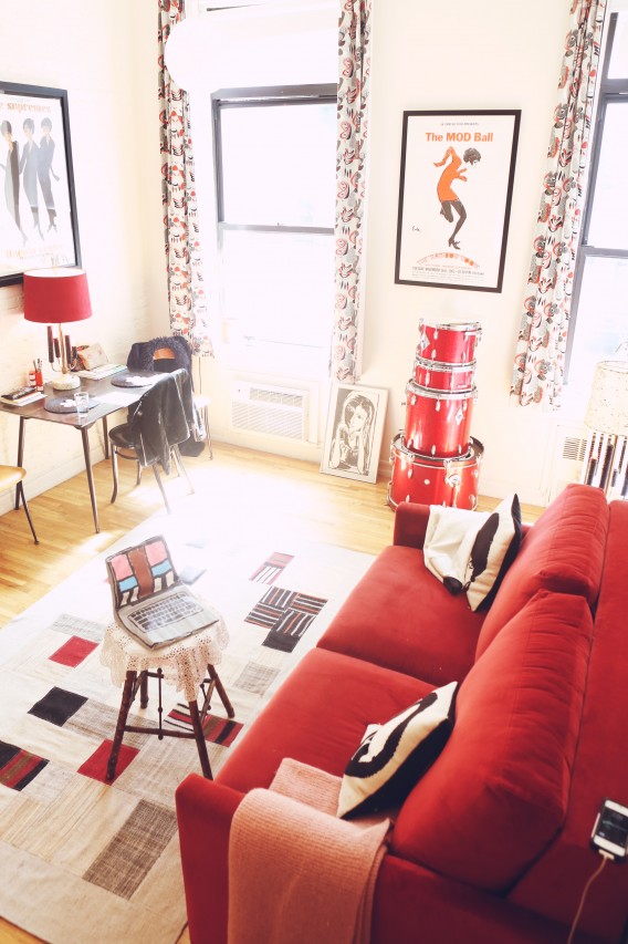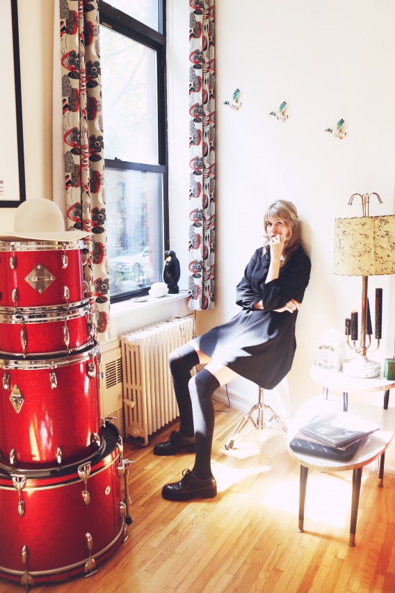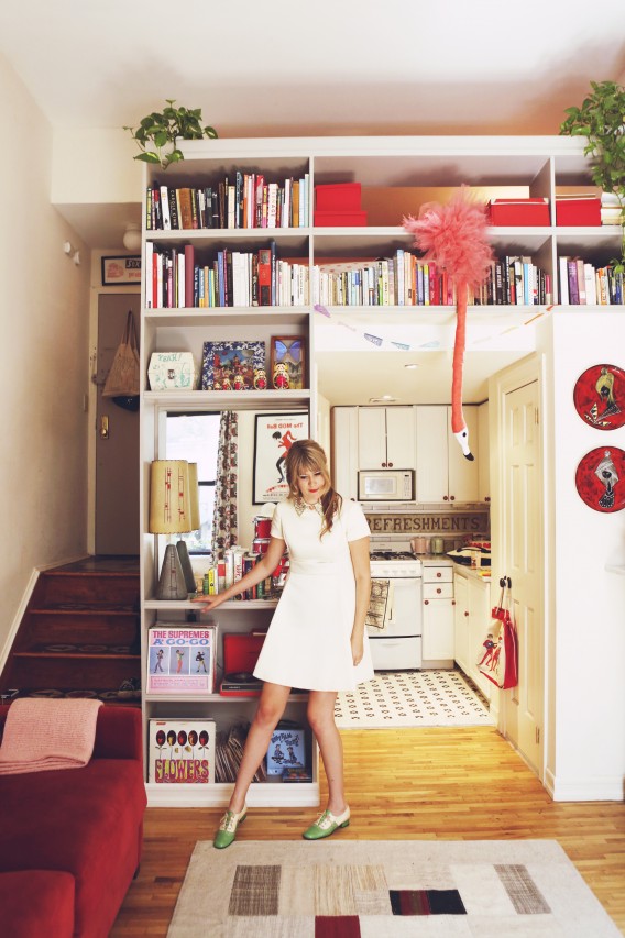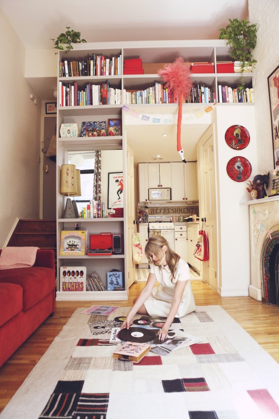 Tennessee Thomas’ apartment looks just as I’d imagined: cute, retro and little. It reminds me of the rabbit hole in Alice in Wonderland when everything seems to be shrinking, but really it’s just Alice growing bigger and bigger. Everything in the house, from the cups to the hangers to the rug is part of the same adorable theme and curiously enough in sync with its owner’s quirky voice, soft British accent and batting lashes. I’d call it ‘mod’ but Tennessee has a wilder imagination. “It feels like a little boat!” she smiles. She’s been living here for two years now and made it her very, very own. “I looked at seventeen places in one day during a blizzard!” she shivers – she moved here from Los Angeles. “When I saw this place it had great energy! An artist had lived here and all the walls were painted with insane murals of cats and grasshoppers in technicolors! But with the big windows it was bright, even though it’s tiny. I love my loft bed. It’s like a little cave! Or a tree house! I considered keeping the murals but decided that all my own stuff is already crazy enough. I didn’t need any more inherited wackiness!”