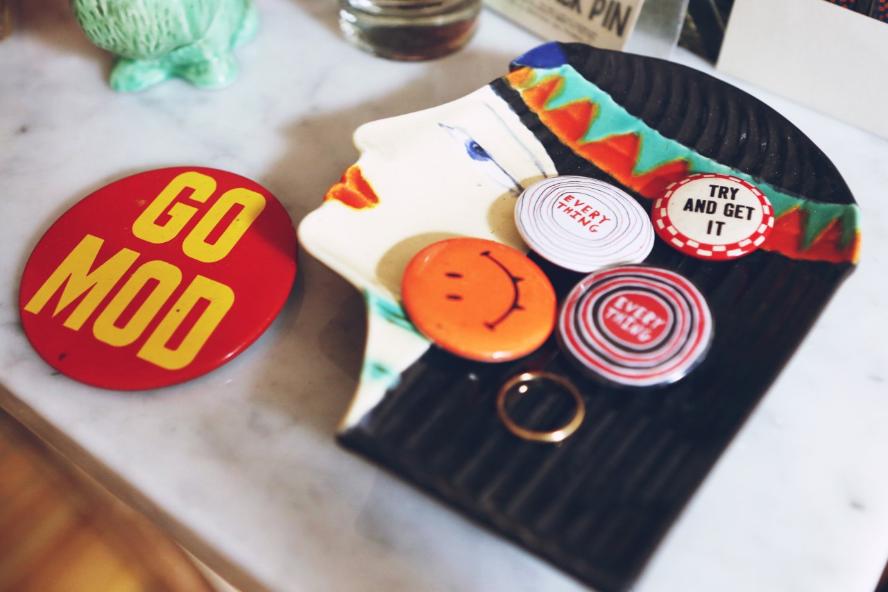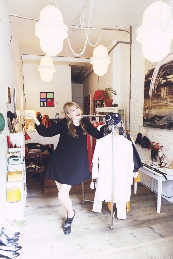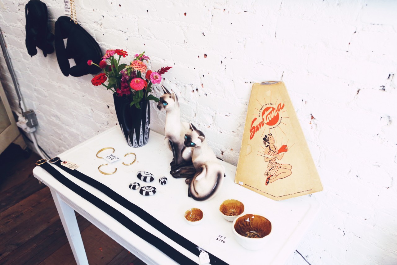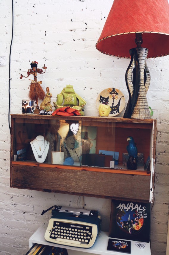 But the biggest surprise and impromptu career move came when she took over the lease of an empty store front in the East Village a few weeks ago. “I kept walking past empty shops and had a fantasy of having a space of my own,” she says dreamily, “a headquarters for think tanks and salons and community-based collaborative projects. I mentioned the idea to a few friends, and a few months later one friend said, “I think I’ve found you a shop!”. The owners of one of my favorite antiques shops, A Repeat Performance took the lease on the shop next door to them, basically to protect the integrity of the East Village as an artistic community and to keep out a Starbucks or whatever! I was introduced to them and we decided to split the shop. We sell some of their incredible mid-century antiques and I pull in local artists and designers! It’s working very well! I’ve met so many local characters. It’s amazing! It’s so fun to have a club house!”
