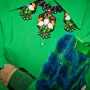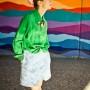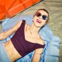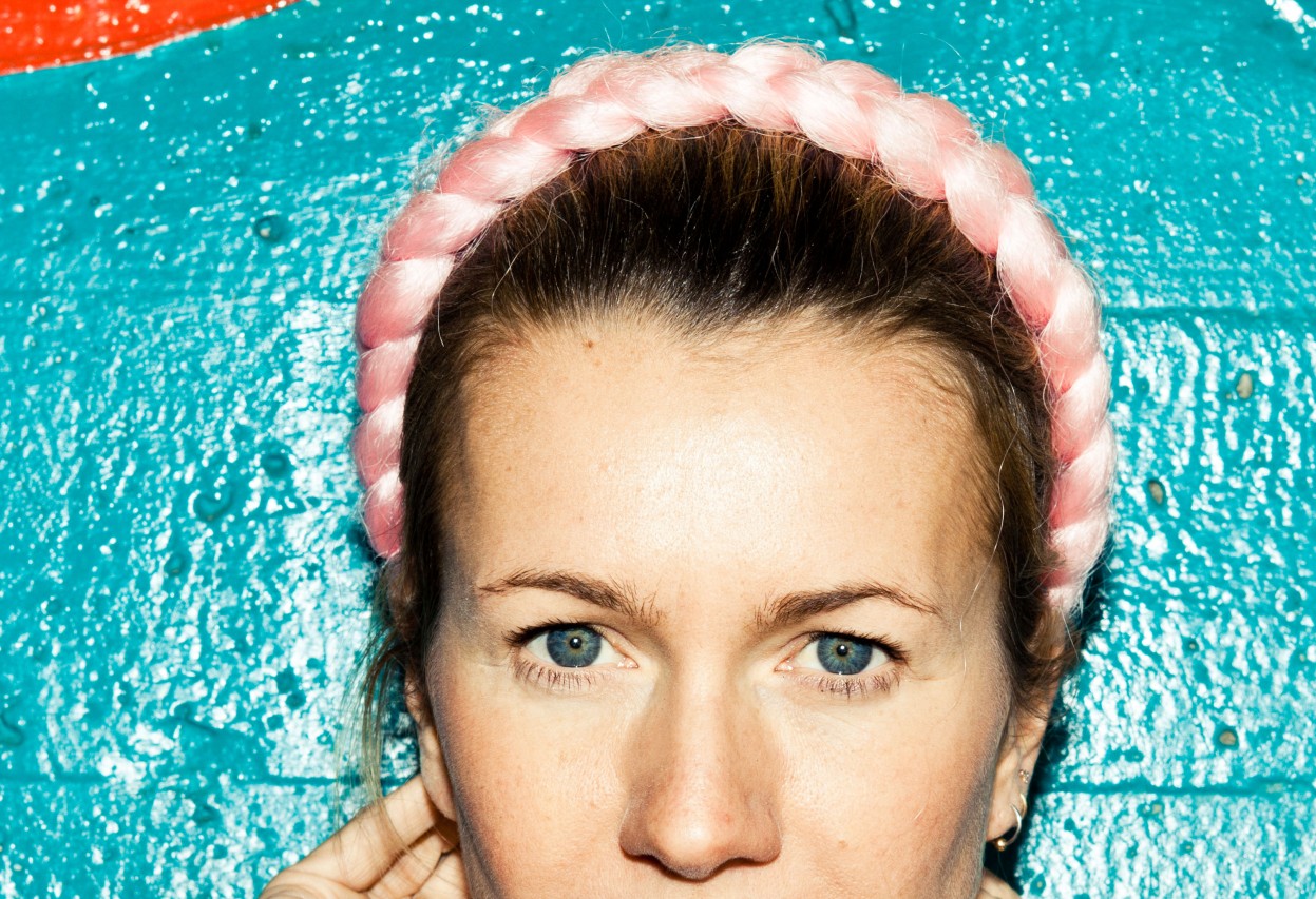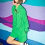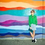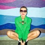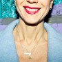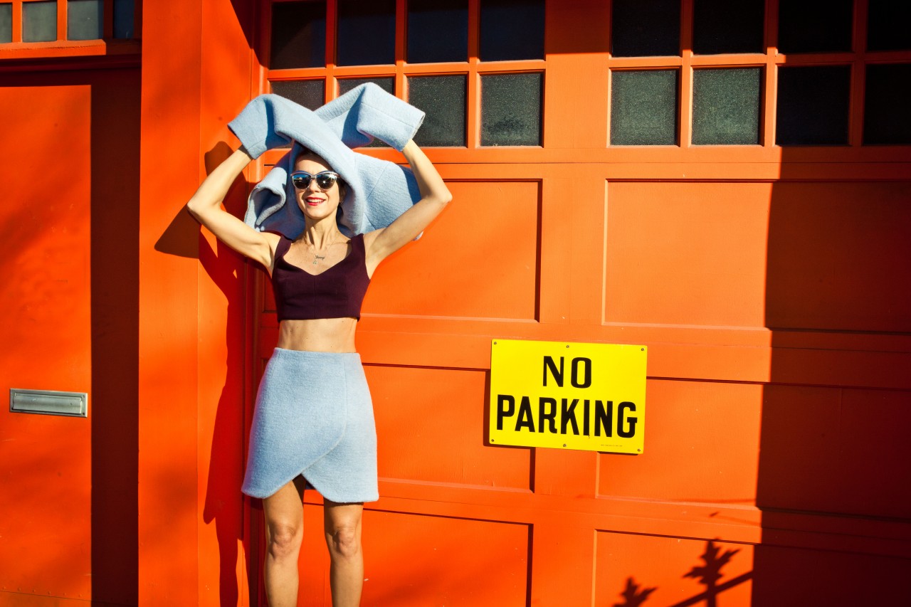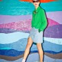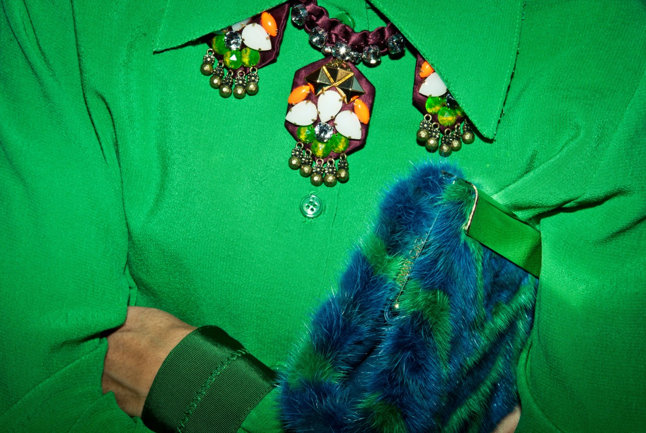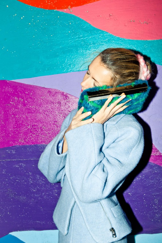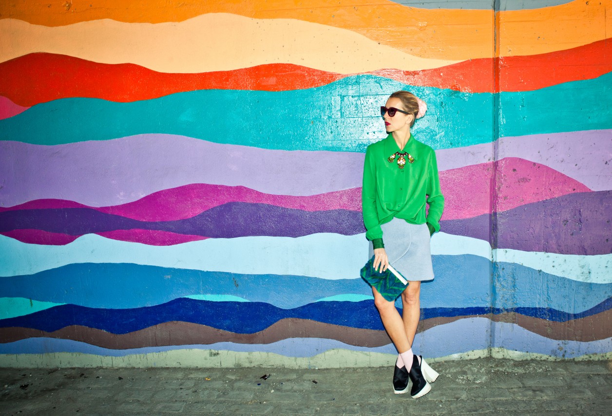 Light blue, wool jacket and skirt combination, grass green jumpsuit, white and blue checkered top, plum burgundy cropped top, platform shoes by Carven; Burgundy felt sunglasses by Italia Independent; Light blue pearl ‘Demoiselle’ sunglasses by Dior; Emerald and turquoise marble fur ‘Cayla’ clutch by Jimmy Choo; Embellished necklace by J.Crew; Mini-script nameplate necklace by BaubleBar.