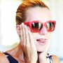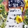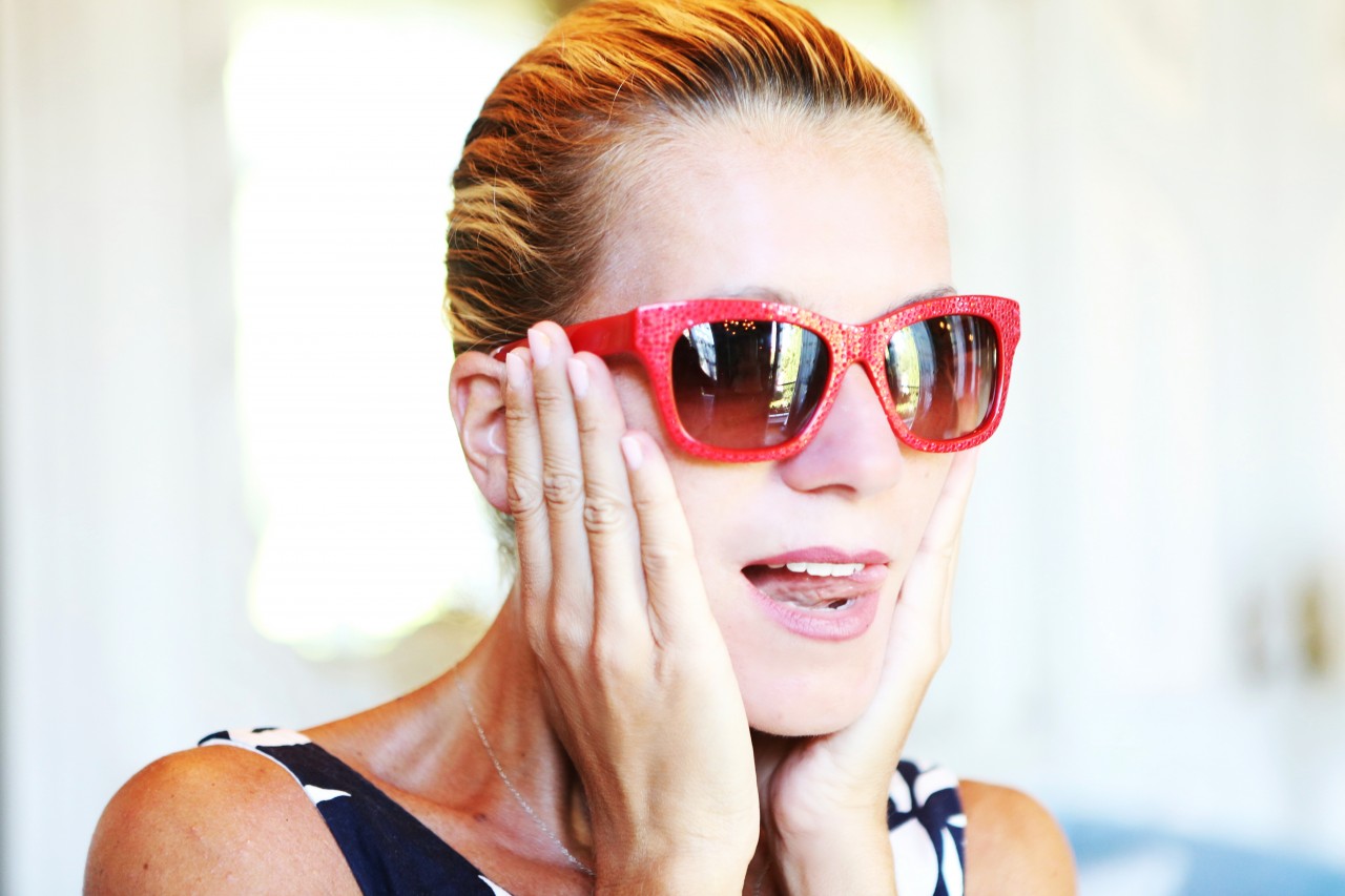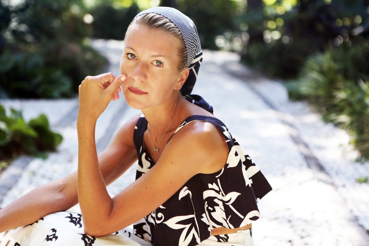 Vintage pleated skirt from A Outra Face de la Luna in Lisbon; Vintage Hawaiian floral ruffle crop top; Black raffia sandals by Dolce & Gabbana; White wide legged pants by Galitzine; Vintage head scarf, my mom’s from the 70s; White platform sandals by Prada; Red purse and red studded sunglasses by Valentino.