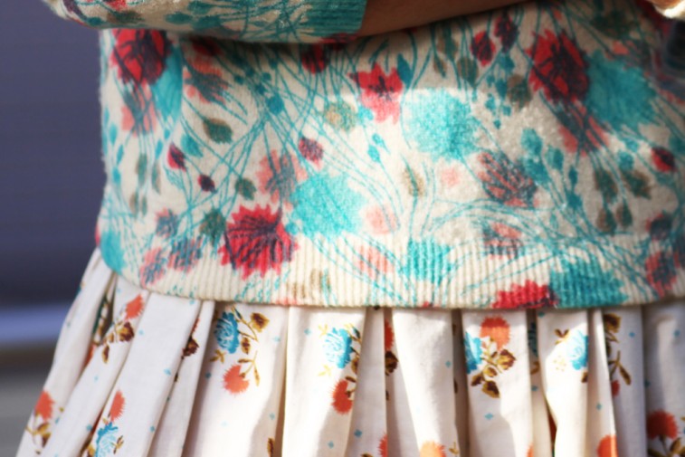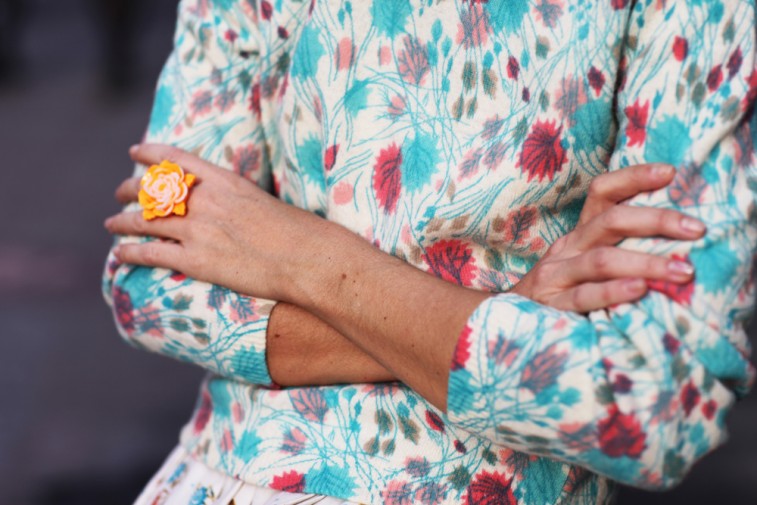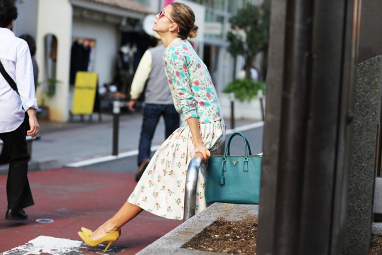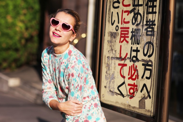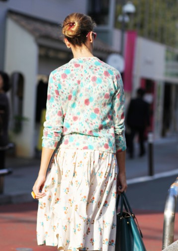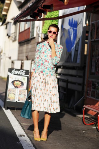 Street Peeper and I decided to do a little shoot on my first day off. He caught me on the back streets of Omotesando Hills in a wildflower vintage sweater, rose print vintage skirt skirt and a pair of heart shaped pink sunglasses I just bought. My mom got both pieces for me last week, the sweater first, at Artists and Fleas in Williamsburg. And when we saw the skirt two hours later, at the Chelsea Garage, we thought the ‘non-matching matchiness’ was too good to pass up. It’s pretty dead-on. And you recognize my yellow suede Aldo pumps and cobalt Prada bag…