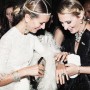 Cream lace and crepe dress by Alessandra Rich; Bracelets, ring and earrings by Lulu Frost; Minaudière by Rafe New York; Vintage Rhinestone headpiece and feather boa at New York Vintage; Pink satin mules by Sportmax; Make-up provided by Chantecaille; Hair by Valery Joseph Salon at Barney’s New York.