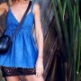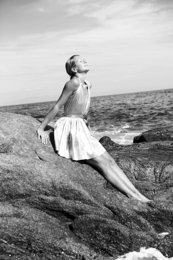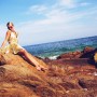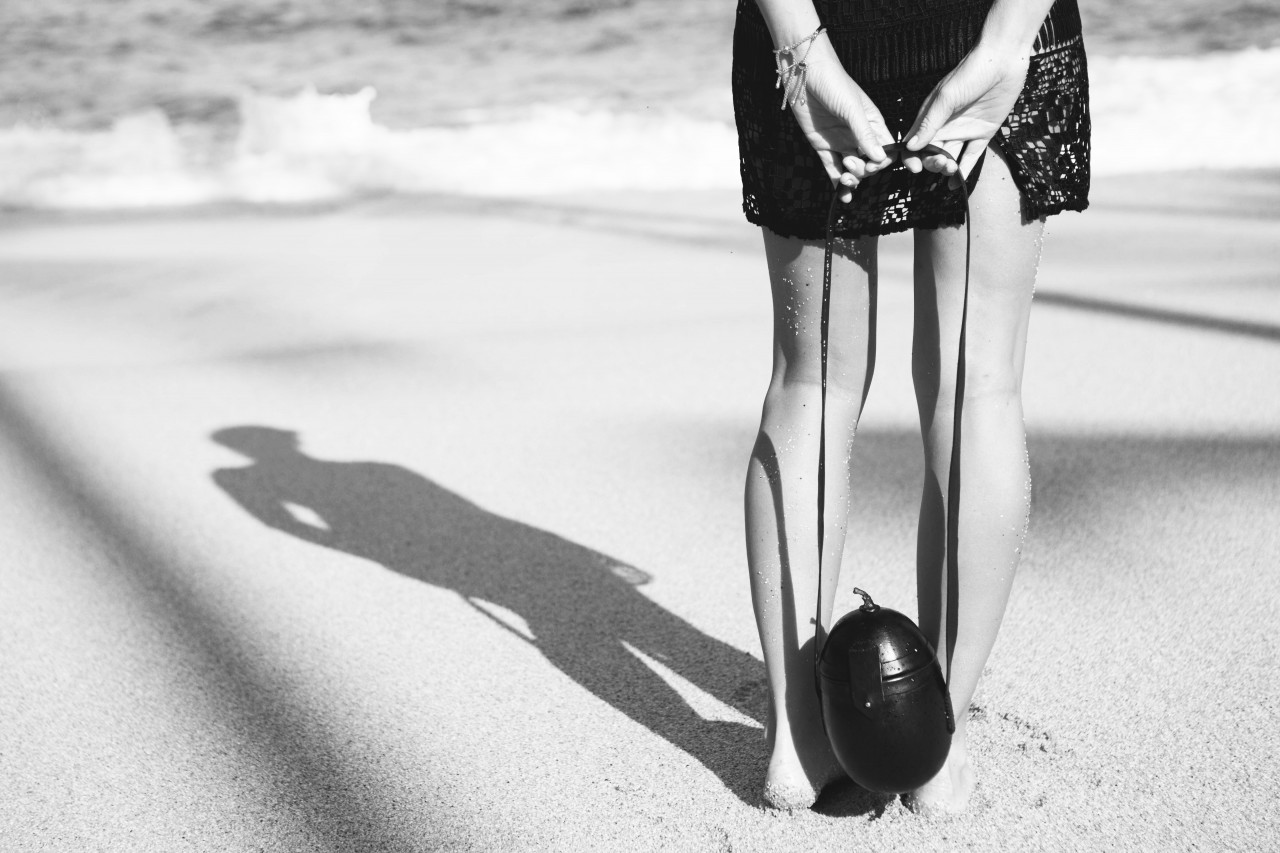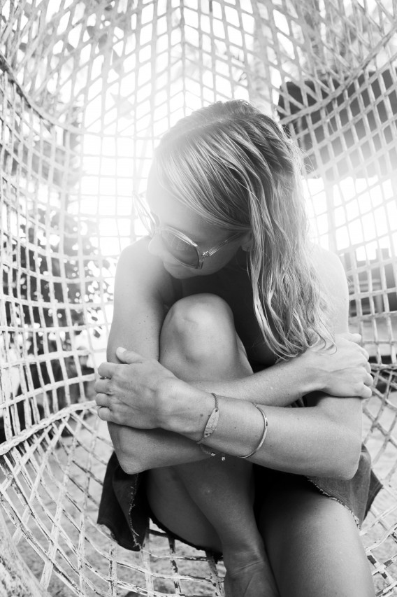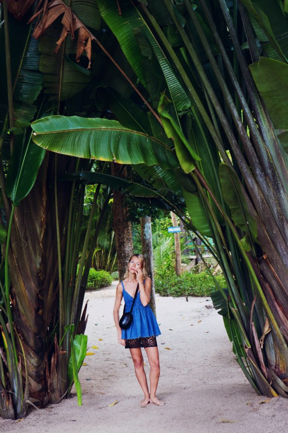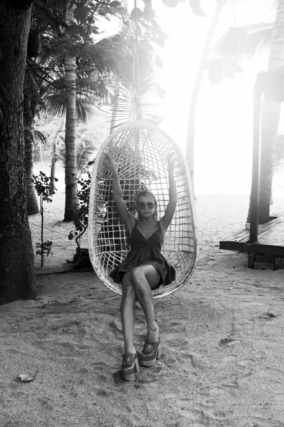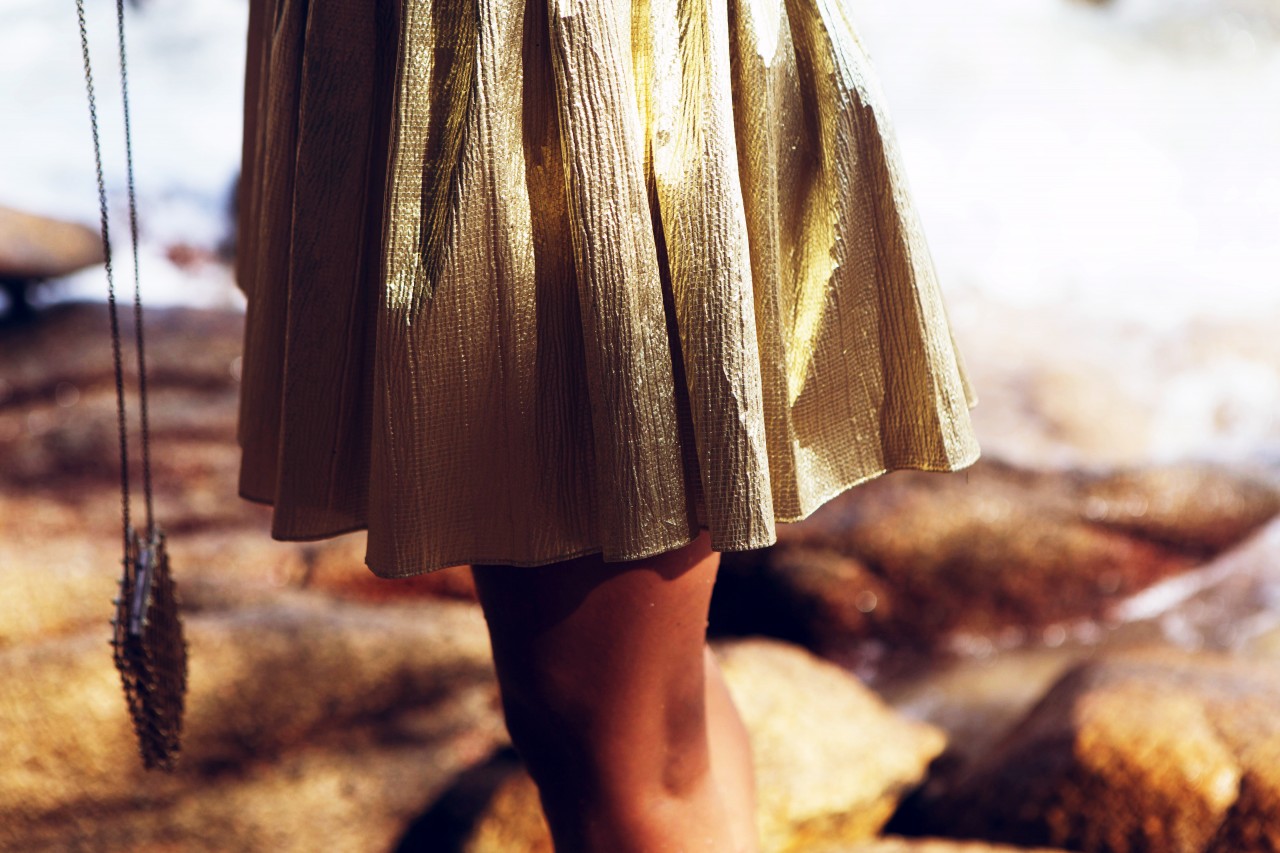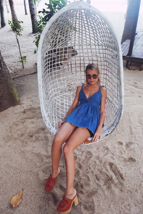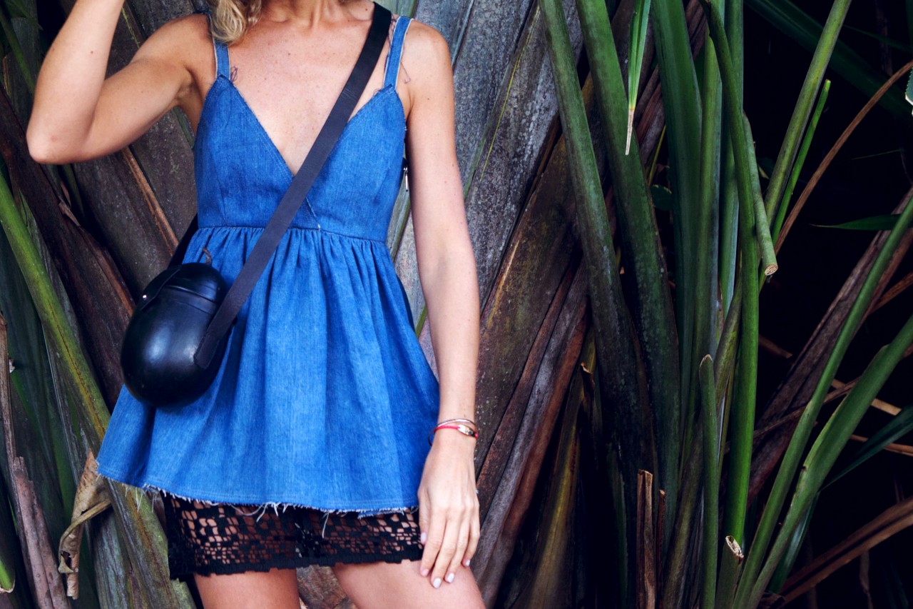 Denim empire waist top, black lace skirt, gold party dress, linen, high-waisted shorts with matching bralet top by Kalmanovich (contact LuxCartel for more info); Black cut-out ‘Elina’ bathing suit by Marianna G; Calabash ‘Cannonball’ bag by Jacmel & Co, made by local artisans in Haiti, with the help of a Belgian girl named Lucie Cincinatis; Gold mesh phone holder by Anndra Neen; Wooden platform clogs by Rochas; My vintage 70s sunglasses.