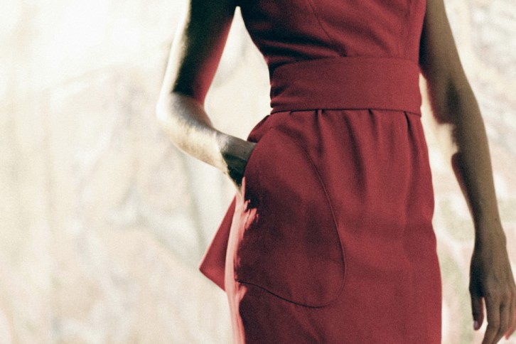 Thierry Mugler, red, cotton bow dress (at Marmalade Vintage), Cesare Paciotti black suede and patent leather heels, vintage black reading glasses. Photos by Aram Bedrossian