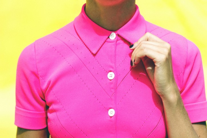 Vintage fluorescent pink shirt, Theory white cotton & lycra cropped pants, Prada dusty pink kitten heel slingbacks, Karen Walker fuchsia plexi sunglasses. Photos by Aram Bedrossian