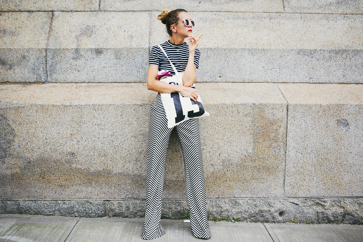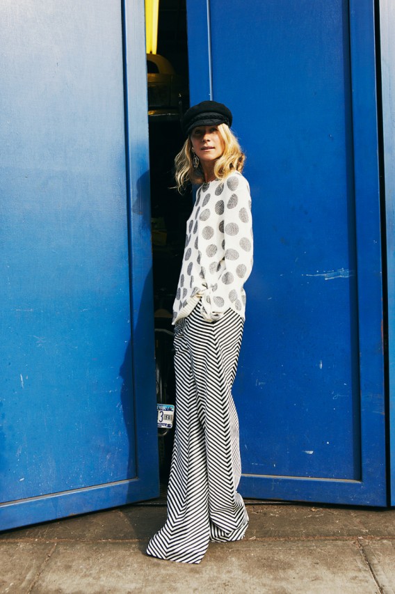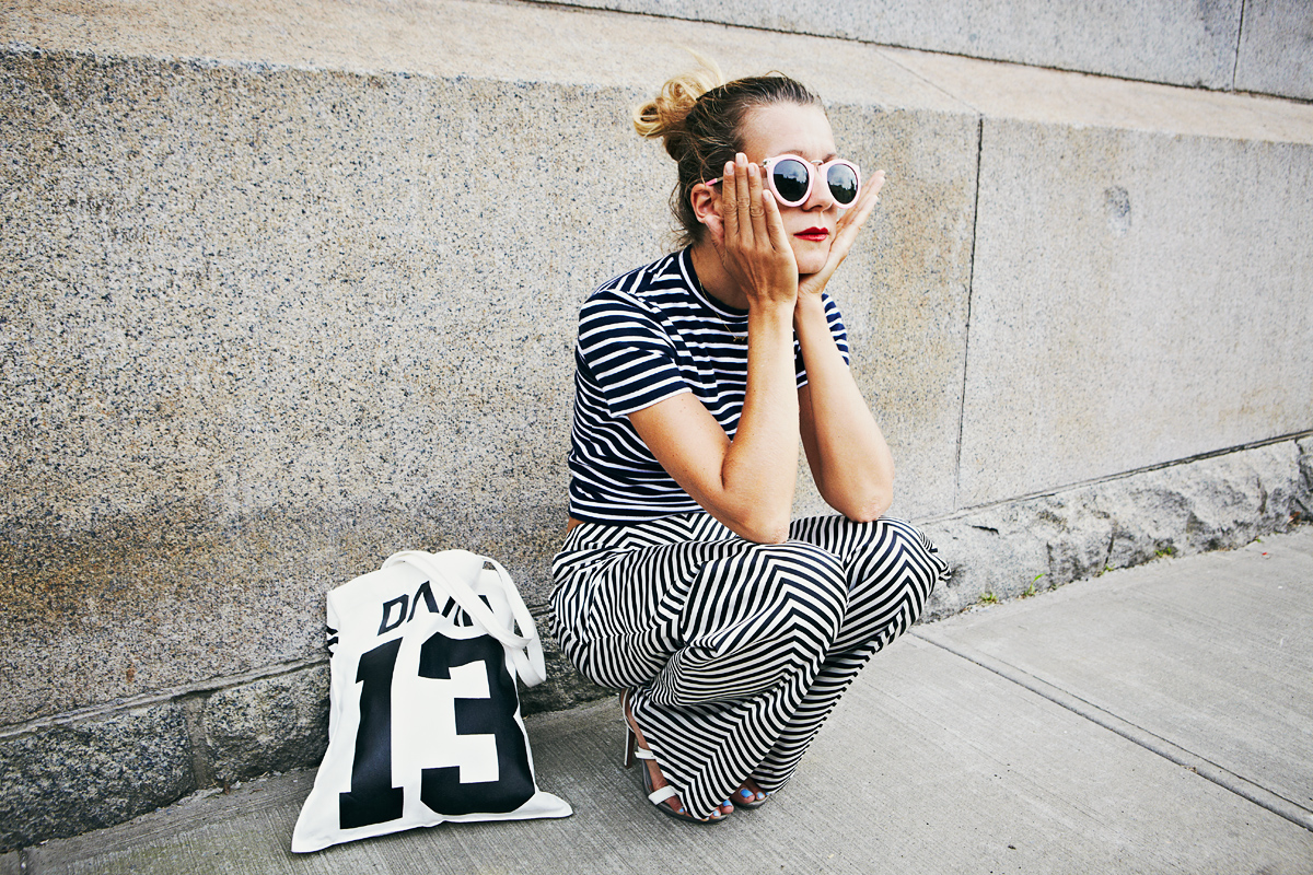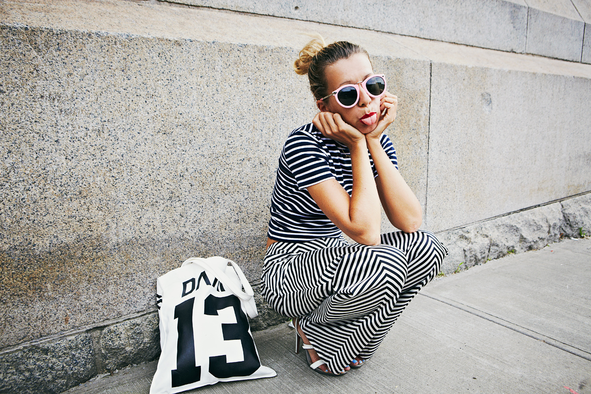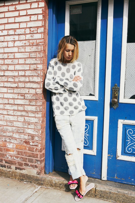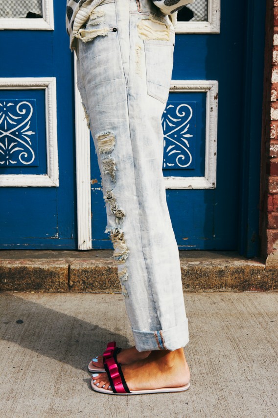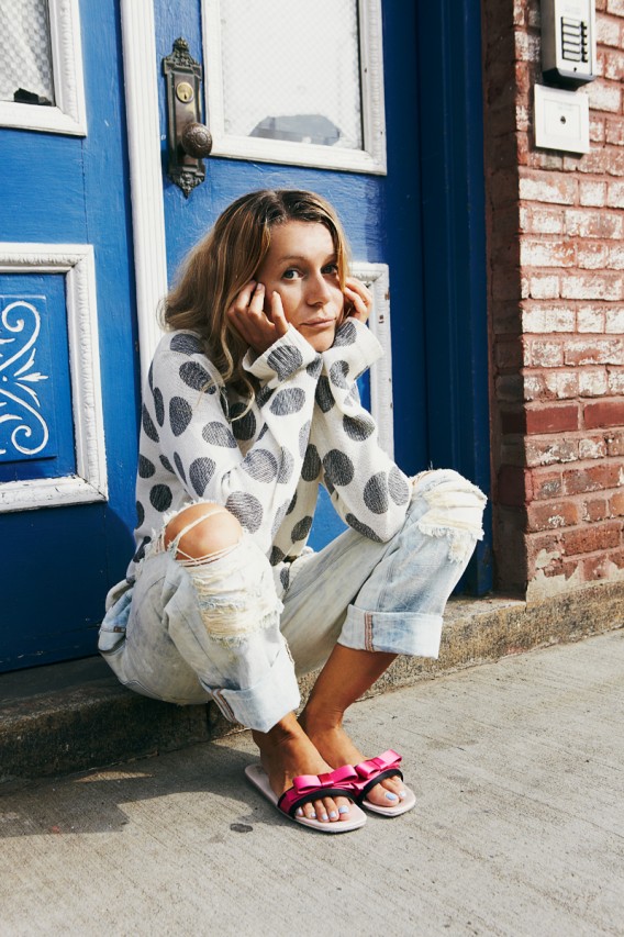 On me: Striped pants, ripped jeans and polka dot sweater by Sass & Bide; Striped, cropped T-shirt by Alexander Wang; Vintage sailor’s hat; White ‘Ardenne’ sandals by Sportmax (shop similar at Casadei); Slippers with pink bow by Prada; Canvas bag by Dan Single for Animaals; Lucite and gold earrings by Alexis Bittar; Pink ‘Harvest’ sunglasses by Karen Walker.