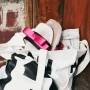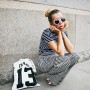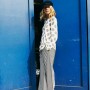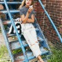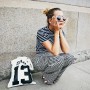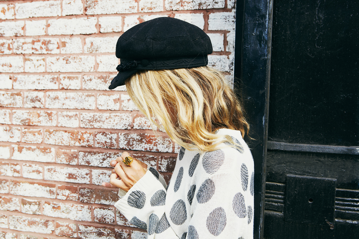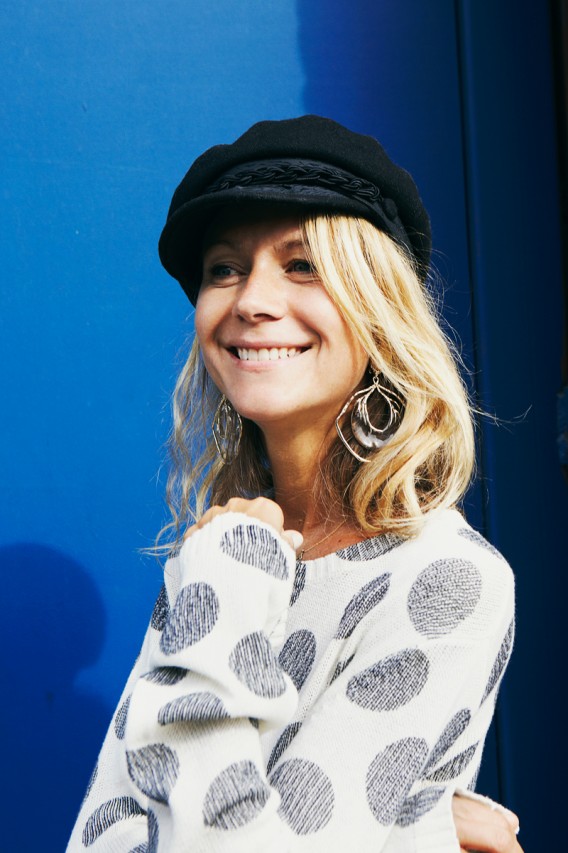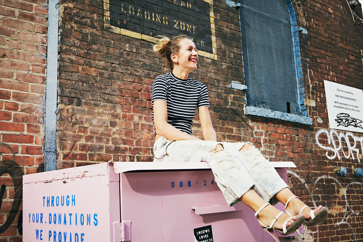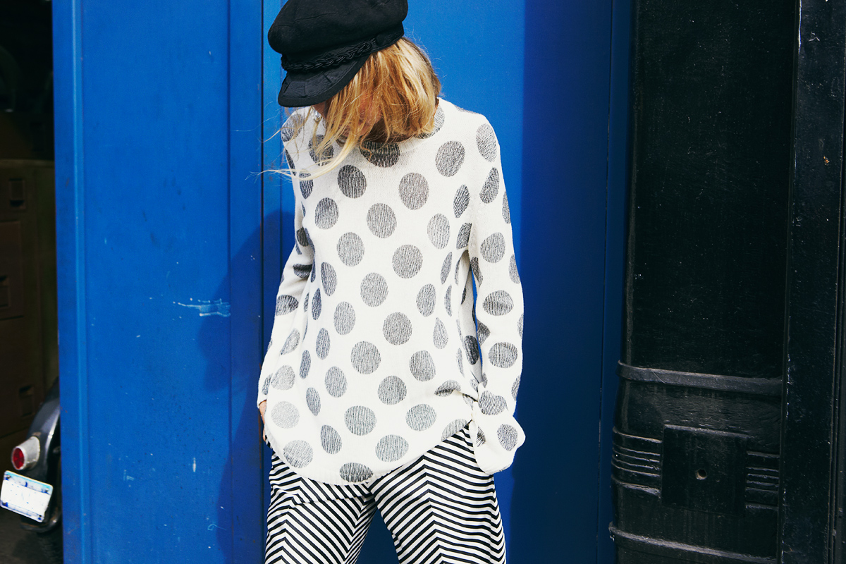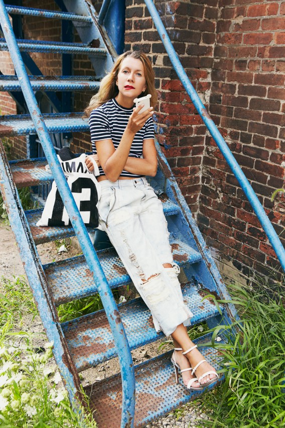 On me: Striped pants, ripped jeans and polka dot sweater by Sass & Bide; Striped, cropped T-shirt by Alexander Wang; Vintage sailor’s hat; White ‘Ardenne’ sandals by Sportmax (shop similar at Casadei); Slippers with pink bow by Prada; Canvas bag by Dan Single for Animaals; Lucite and gold earrings by Alexis Bittar; Pink ‘Harvest’ sunglasses by Karen Walker.