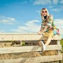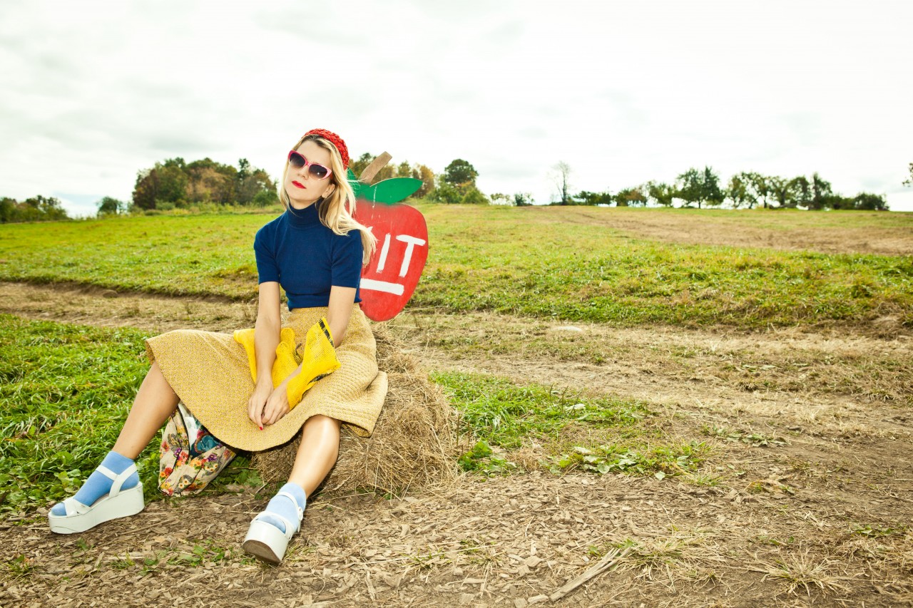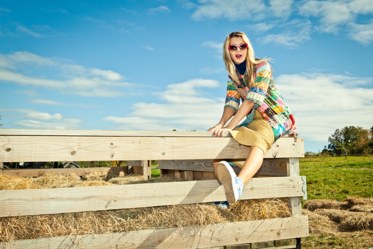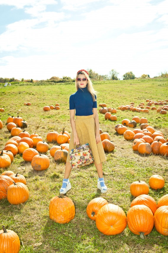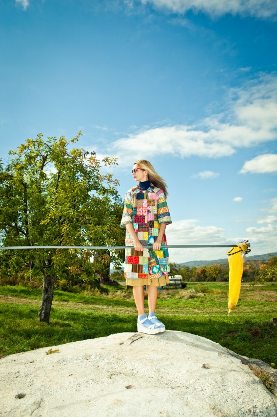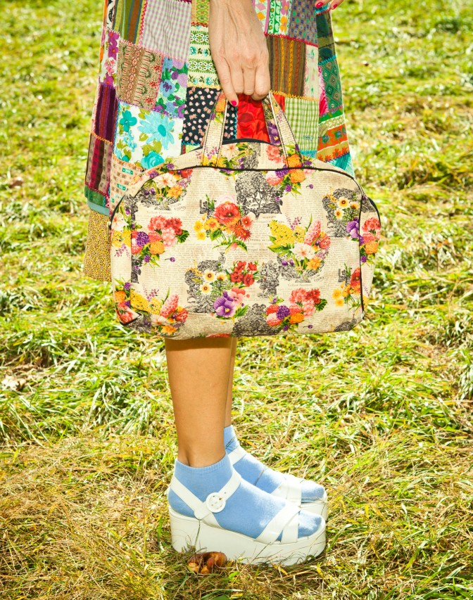 Vintage padded, paisley print circle skirt, patchwork coat, blue turtleneck and flower print bag; Ombre pink cat-eye sunglasses by Morgenthal Frederics; Flower head band by Sophia 203; White platform sandals by Prada.
