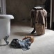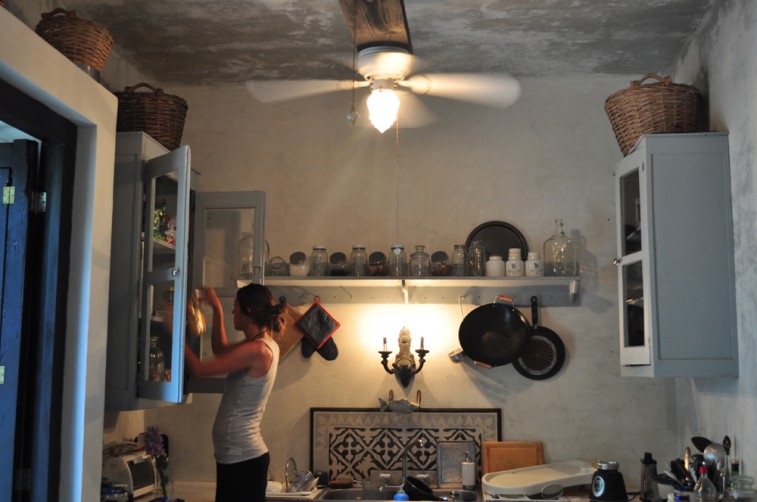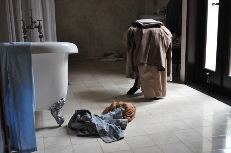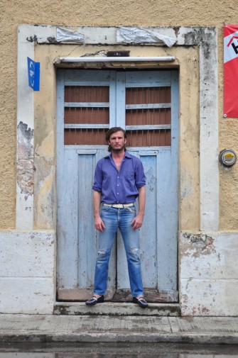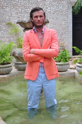 When I arrive at the house, rain clouds have gathered over Valladolid. The rooms are dark and humid but I am glad to feel the cold air of an air conditioner on my sun burnt skin. (My hotel room on the beach does not have AC). His wife Francesca summons me to the kitchen for tea and cake while Nicolas finishes a quick meeting with a local salesman and prepares the spare bedroom / closet for our shoot. The 30-minute rain shower is a welcome relief and leaves the courtyard smelling like tropical flowers. “Can you hear the birds?” Francesca asks me somewhat upset. “We have to keep them in the outdoor toilet because they’re too small and vulnerable to stay out here. Cats would eat them!” Nicolas got two baby peacocks for his birthday. His long time friend and fellow model Robert Konjic and his girlfriend Julia Restoin remembered his childhood infatuation with peacocks and found nothing better but to get him a pair! (You have to buy a boy and girl and get special food; they are sort of a protected animal in Mexico.) They even named the birds after them, so Nicolas would have them “in his life, every day”. And though the thought of that pleases him in theory, the practical notion of raising two of nature’s loudest and fussiest birds leaves him helpless and visibly nervous.