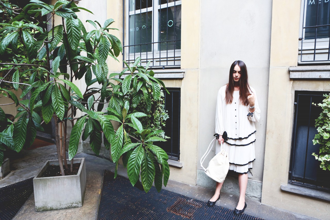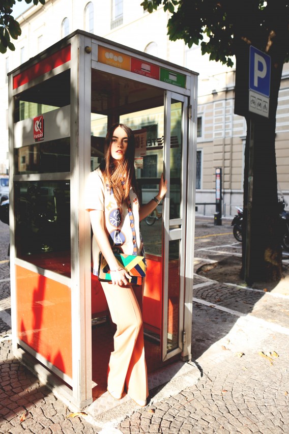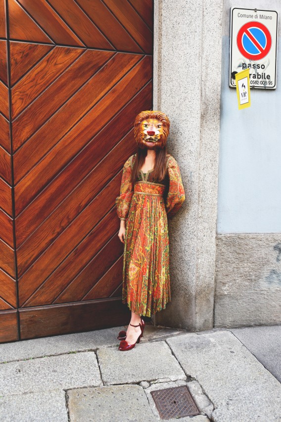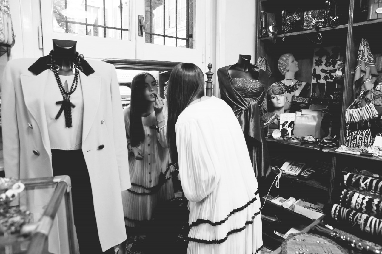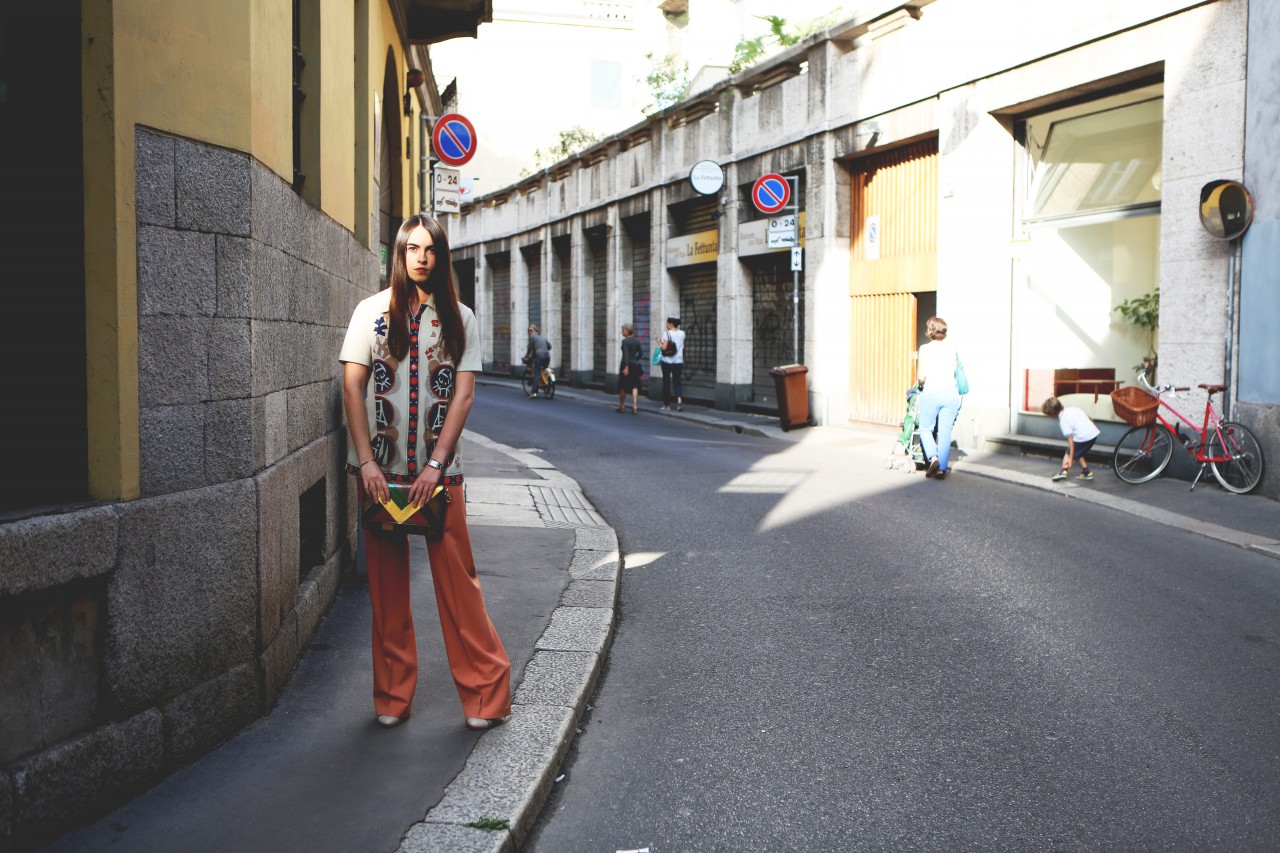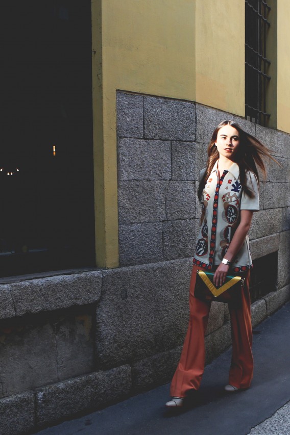 But today we have a shopping date in Milan and I get a sense of Melusine, the fashionista. “Do you mind if we reschedule for a few hours?” she begged me on the phone earlier. “I went out really late last night and this morning I had the Ferragamo show, so I think I need to sleep a little bit more.” Not a problem. Been there, done that. When she walks in the door of Wait and See around 3 PM, she looks rested, radiant and ready for action. She even put on red lipstick, which, set against her pale skin, makes her look like a modern-day Snow White, albeit slightly hungover. She picks her outfits with deliberate motivation. She loves oversized boyfriend blazers and elegant pant suits, nothing too flashy or overtly retro. She’s in her element, repeatedly asking to see “the effect” of each shot on my camera screen and trying new poses. “I love making pictures,” she smiles.