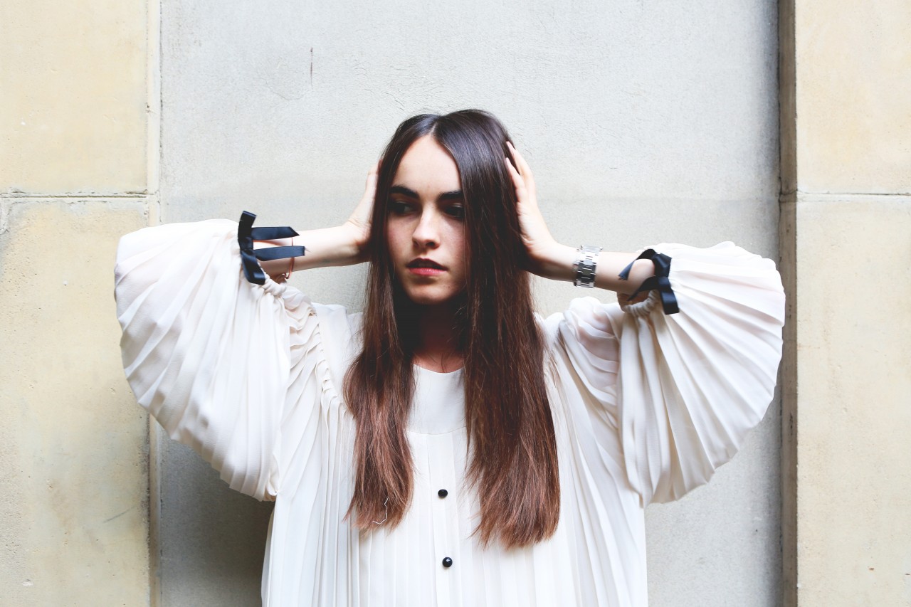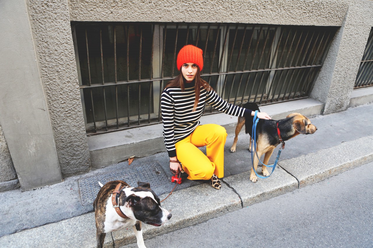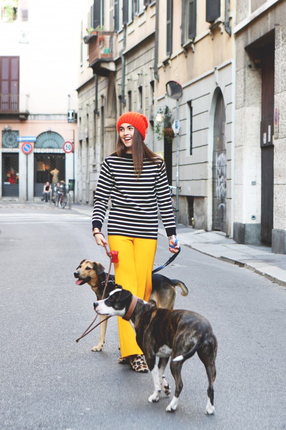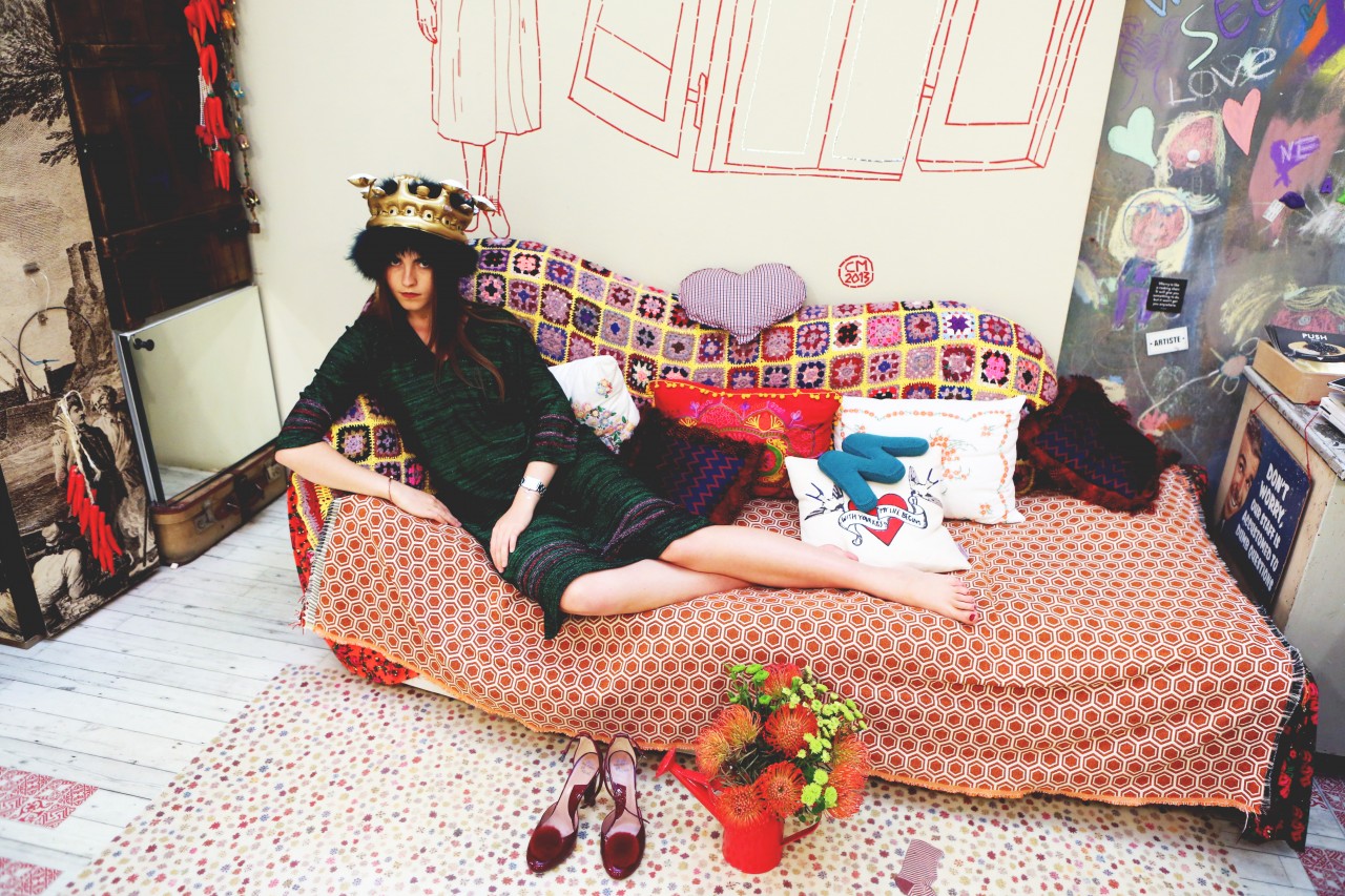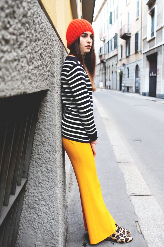 But today we have a shopping date in Milan and I get a sense of Melusine, the fashionista. “Do you mind if we reschedule for a few hours?” she begged me on the phone earlier. “I went out really late last night and this morning I had the Ferragamo show, so I think I need to sleep a little bit more.” Not a problem. Been there, done that. When she walks in the door of Wait and See around 3 PM, she looks rested, radiant and ready for action. She even put on red lipstick, which, set against her pale skin, makes her look like a modern-day Snow White, albeit slightly hungover. She picks her outfits with deliberate motivation. She loves oversized boyfriend blazers and elegant pant suits, nothing too flashy or overtly retro. She’s in her element, repeatedly asking to see “the effect” of each shot on my camera screen and trying new poses. “I love making pictures,” she smiles.