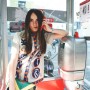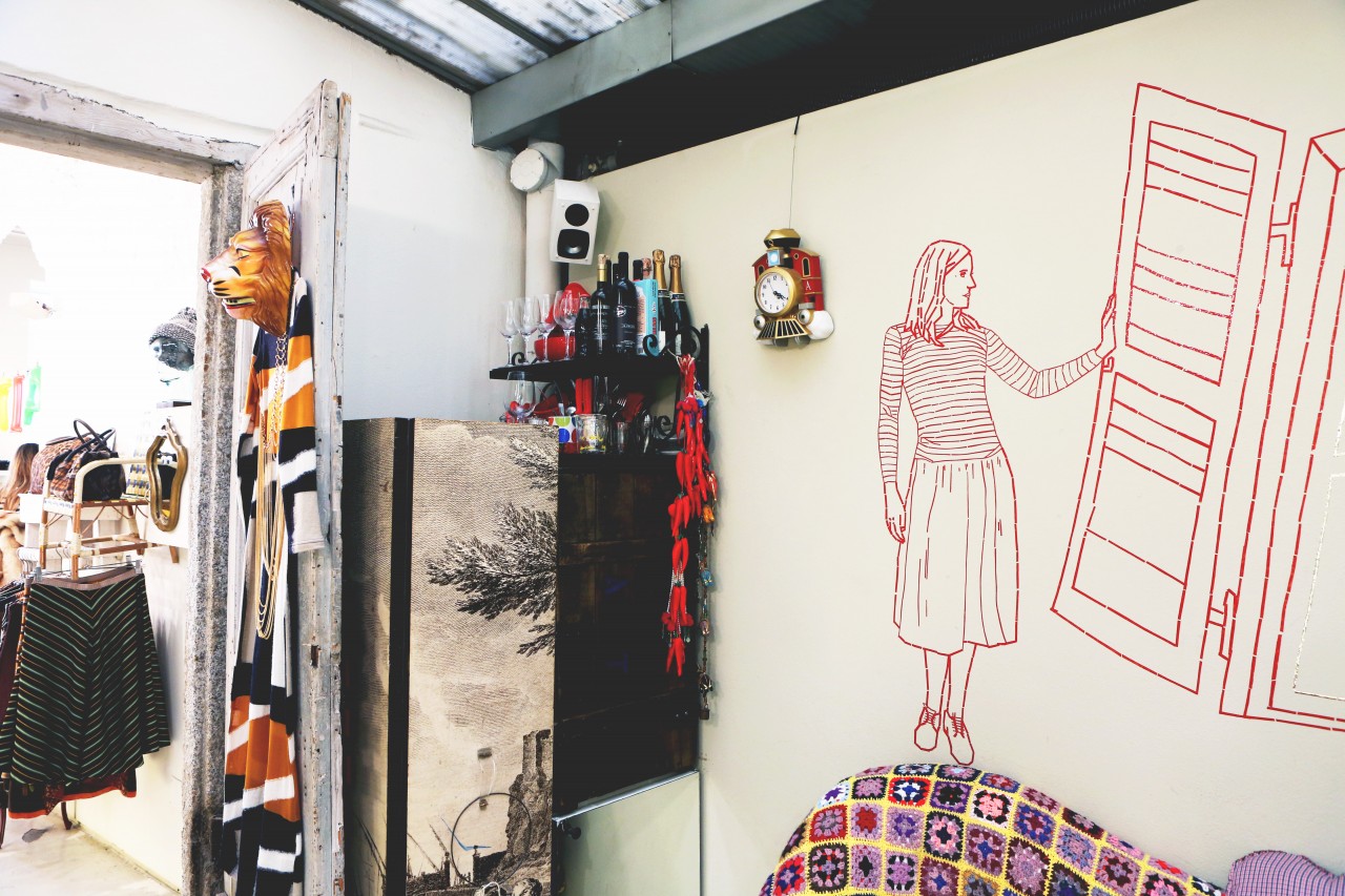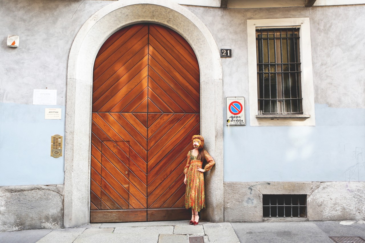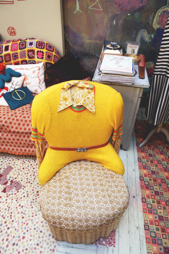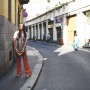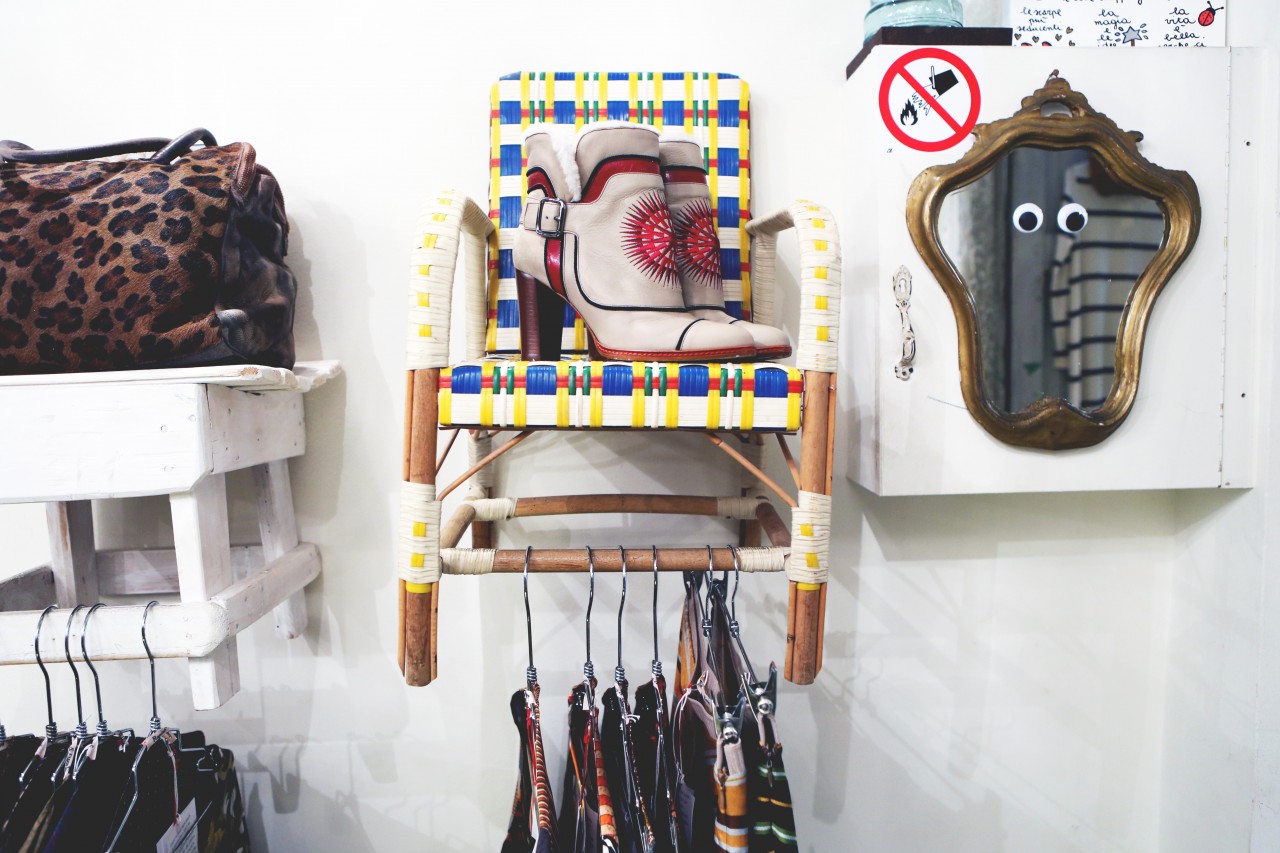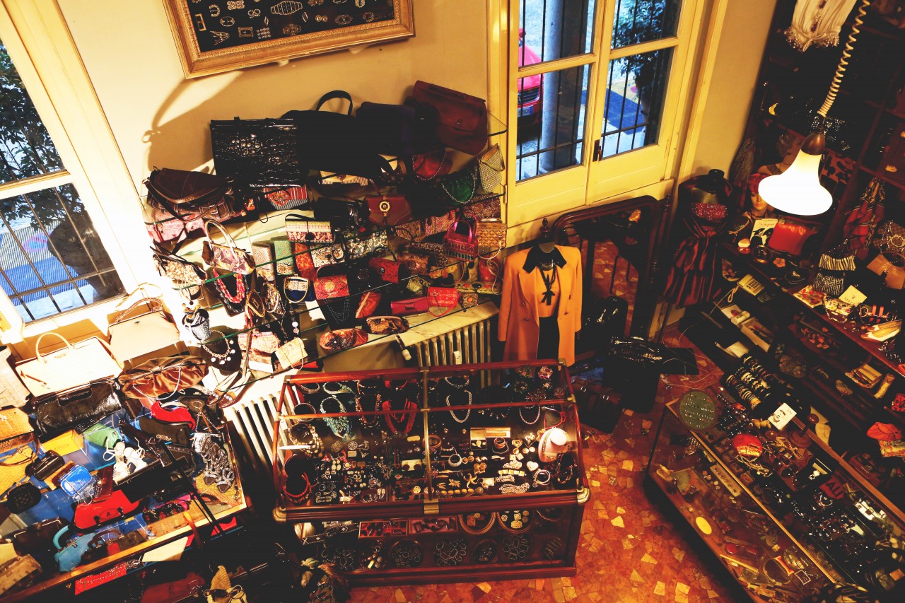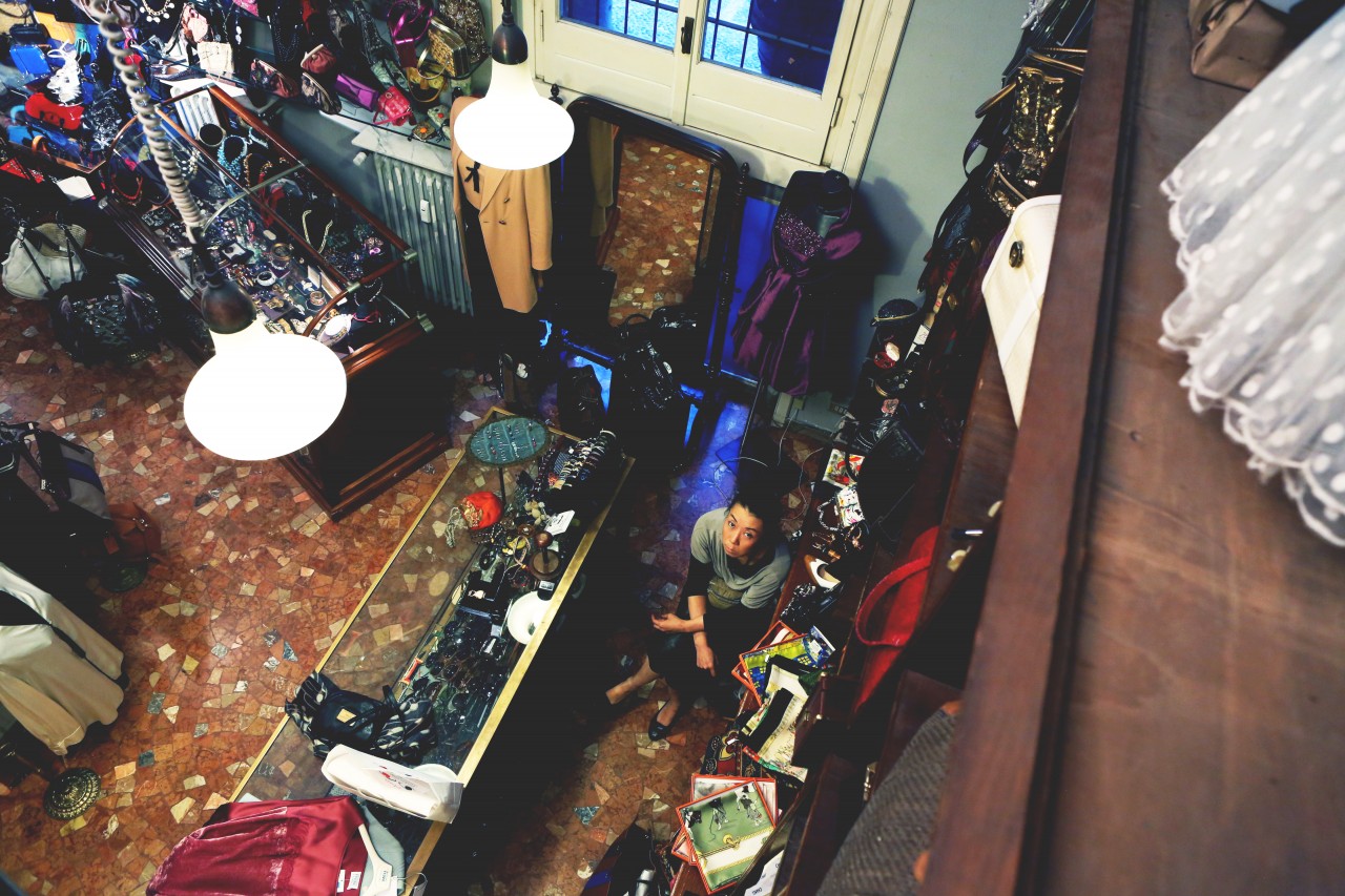 After a few changes and about five strong coffees, we dash off to Franco Jacassi, Milan’s master of vintage. His Vintage Delirium is not a store front – it’s by appointment-only – so I called in advance. Like every Italian, Franco is well aware of the Ruspoli dynasty and is pleased to have a special guest in his store. He hangs around while we dress up, giving us an elaborate back story for every piece we touch. He also tells us he has plans to open a store in New York! “Please let me know if you’re getting bored with me,” he apologizes after a while. It’s hard to stay focused in this place. Not just because we hang on his every word, but mostly because the sheer quality of his collection is overwhelming: old Gianni Versace, classic Pucci, and all things beaded, feathered and embroidered. Melusine has her eye on a black tuxedo jacket. But she finally decides is too big and leaves empty-handed.