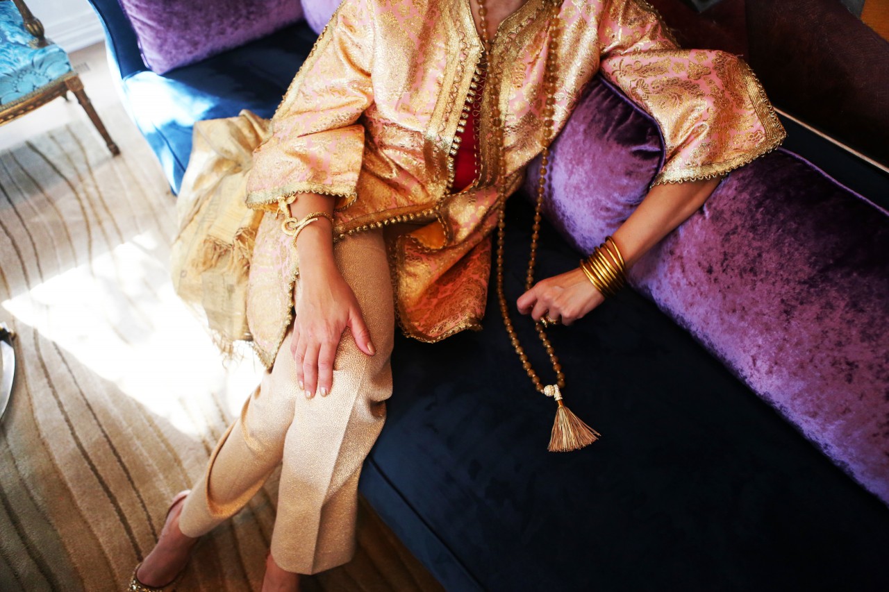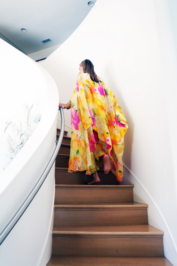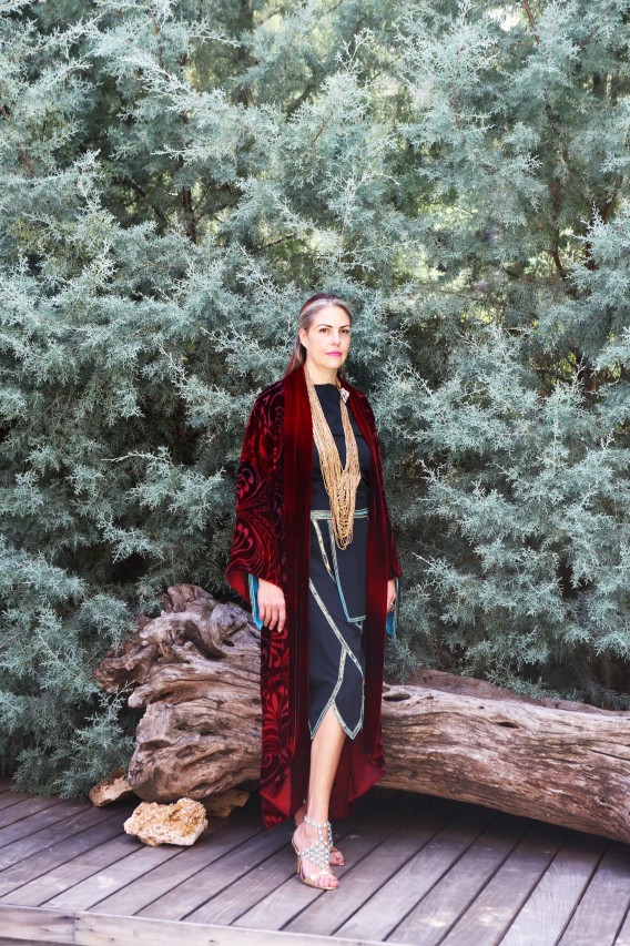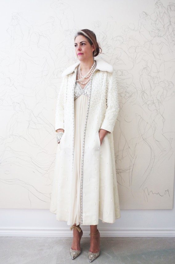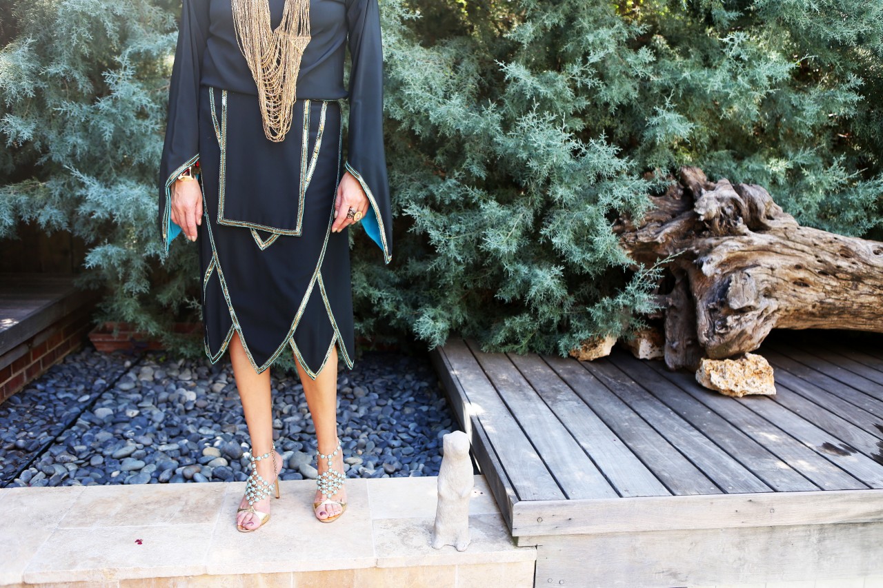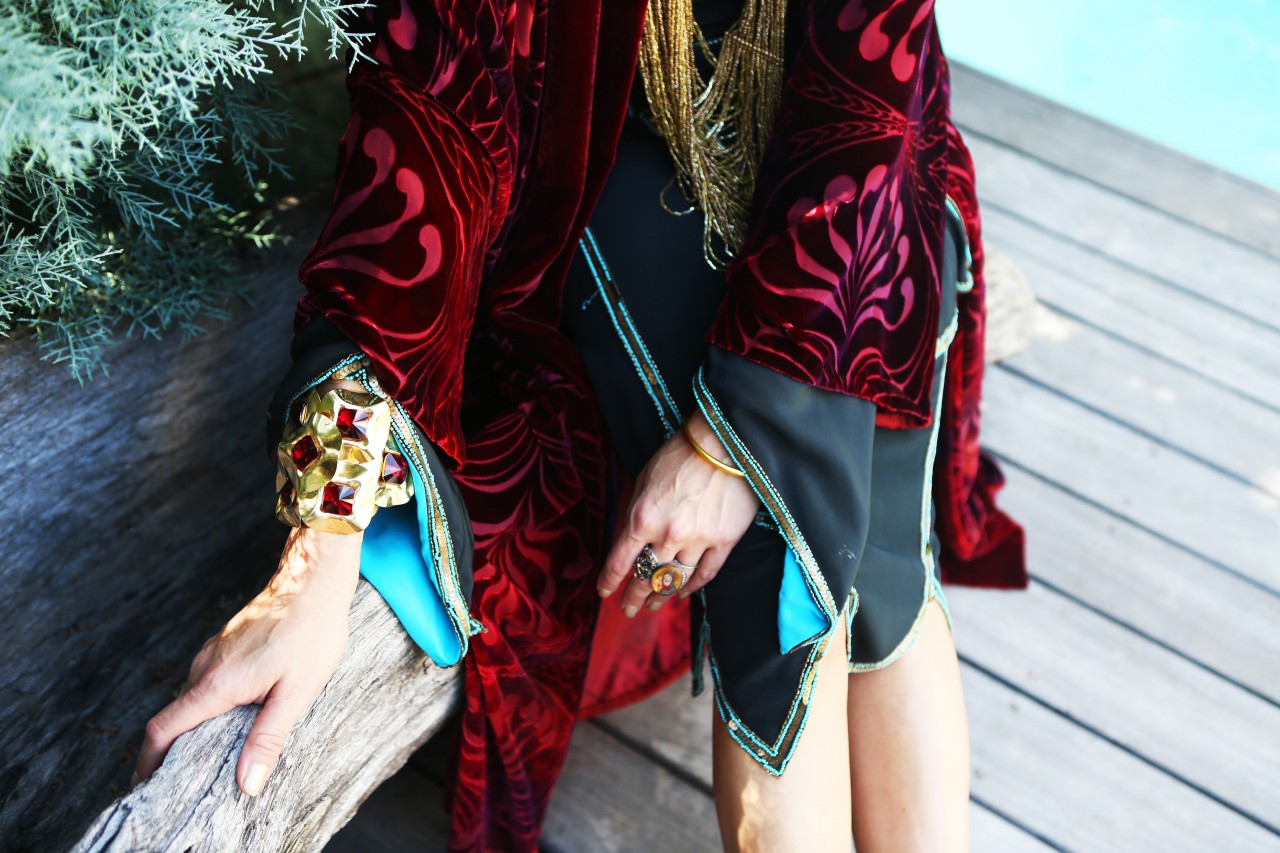 The wonderland tour continues to flabbergast until Jessica opens the closet she’s curated for our shoot. That’s when words and vocabulary become nihil and I manage to just utter a long and exasperated whimper. Jessica’s vintage collection was handed down over generations of fabulous women. There’s the cream chiffon empire waist dress and matching beaded coat she wore at a gala when she was pregnant. “According to my godmother this was a Pauline Triggere… but there is no  label,” she shrugs. And the gold scarf, “gold as in real gold, given to my godmother by HRH Prince Faisal,” she winks. “I can’t confirm this because my godmother told great stories… And this might be one of them!” And the black Galliano tuxedo dress she happily hops in the pool with. “My mother has amazing clothes,” she confirms. “She was of a generation that went to New York and Paris for actual fittings. And some amazing dealers all over the world. My favorite is Heritage in Barcelona. The owner, Edgardo is as interesting as his shop of wonders.” And then there’s the drawers upon drawers of vintage jewelry. “My business partner (in Budha Girl)  is a real collector”, she beams. “She always finds amazing things!”