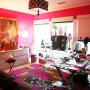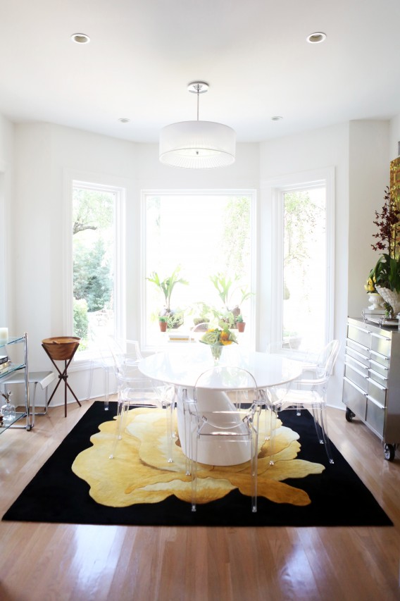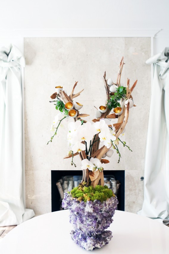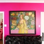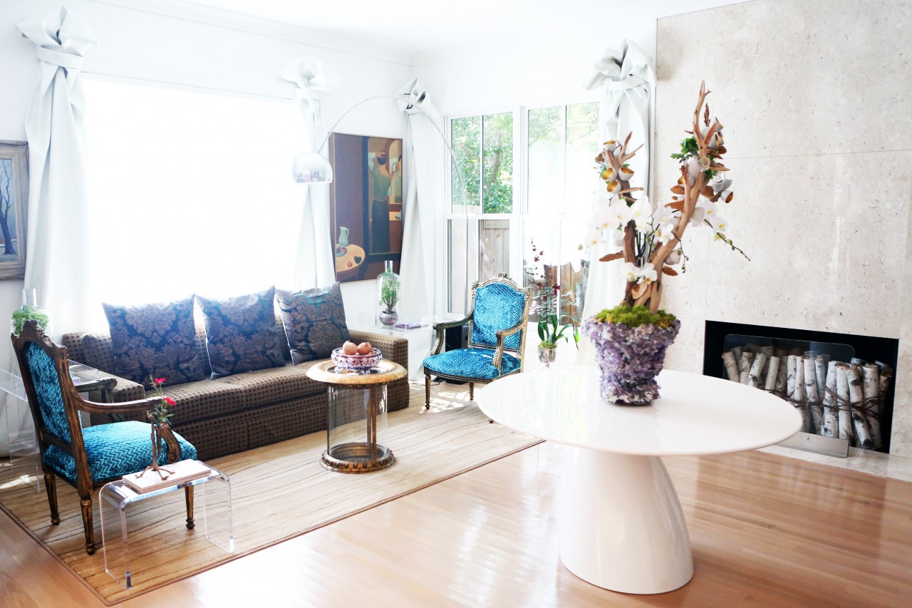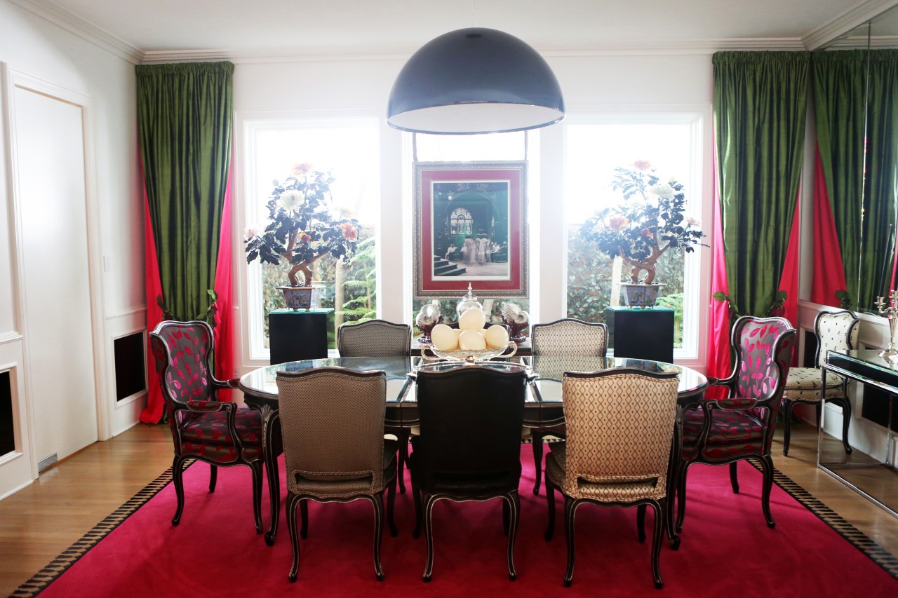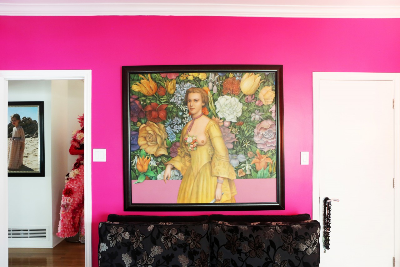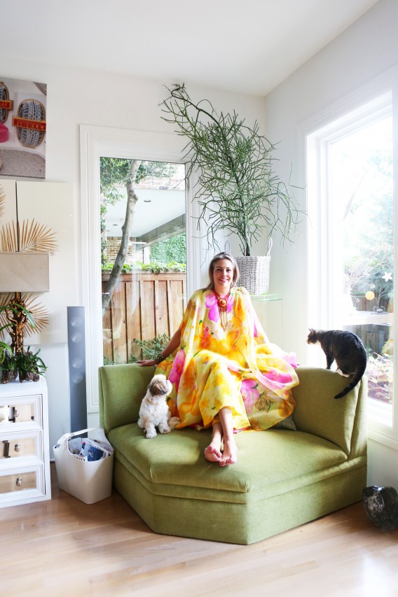 Everything, from the wall paper to the rugs, from the flower arrangements to the chandeliers, from the frames to the books, every piece of furniture looks like it was built and arranged yesterday by a team of obsessive-compulsive, Red Bull chugging bonsai artists. The house is finished. It’s done. There’s not a thing out of place. It looks like a decorator’s wet dream. If you wanted to see every single adorning element in the house, you would spend days, if not weeks. My eyes jump around the rooms like Snow White’s on acid. I’m like a little kid who’s just learned how to walk because everything is new and fresh and comic-book unexpected. The curtains in the foyer are made of vinyl, “because everyone has these awfully heavy drapes in their windows”, the fuchsia carpet in the dining room has a trim Jessica hand painted on the floor – “I had to do it twice because we got a leak and we had to take out the floor boards just as I finished. I wanted to shoot myself!” – and every television is hidden by a wooden box or curtain that camouflages seamlessly into the wall. But the house is not stuffy or egg-shell fragile; it’s lived-in. There’s a cat named Brynn, a Shihtzu named Vodka, a teenager called Sloane, aka the Sloane Ranger, and Jessica does all the cooking, folding, pouring, driving, and growing herself. She runs this house.