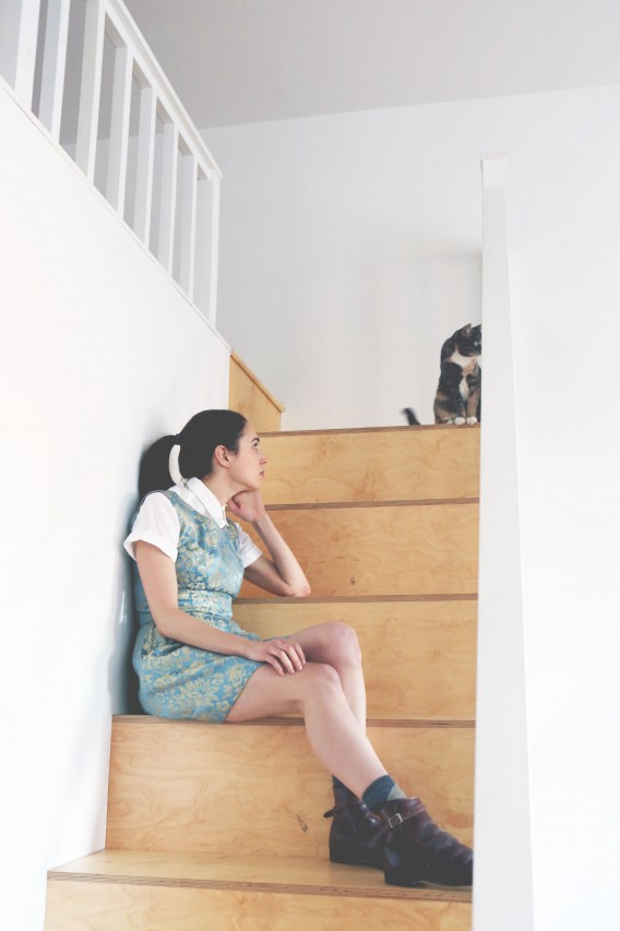 Her own vintage collection consists mainly of little dresses, because, well, she‘s little. She doesn’t own a ton of vintage either but every piece is special to her. “In New York City there are so many great vintage stores that I sometimes have to pretend they don’t exist or else I’d be broke,” she laughs. “I shop when I’m traveling, because I like to go to flea markets and it’s nice to have a shirt or dress that reminds you of a trip.” She props a plate with cookies on her desk and still nurtures the same cola she had when I came in. It’s also hard to pinpoint her style. It’s as if PJ Harvey and Zoey Deschanel met at boarding school and snuck out to smoke cigarettes. “I shopped at thrift stores when I was in middle school (my protagonist’s age) but at that time no one else really got it, and I felt kind of odd,” she shrugs. “I grew up in a town where Abercrombie was the gold standard.” She stores her sweaters in a kitchen drawer, her coats in the hallway and the rest behind sliding doors in the bathroom. “I have no closets in this apartment!” she sighs. “I bought it after a break-up.” She shows me a black, beaded bracelet, that looks old, but pretty and tells me how she likes my dating stories. And as if to give me an idea for a follow-up she says: “The ex who gave me this invited me out to dinner a few weeks ago, and after two hours, just before we left the restaurant, he finally tells me he’s engaged.” Dating catastrophes aside, it seems that Bianca is finally back to basics: still surrounded by books, a cat now called Cleopatra and the cousins…? Maybe she’ll introduce them to Louise in a book one day.