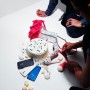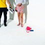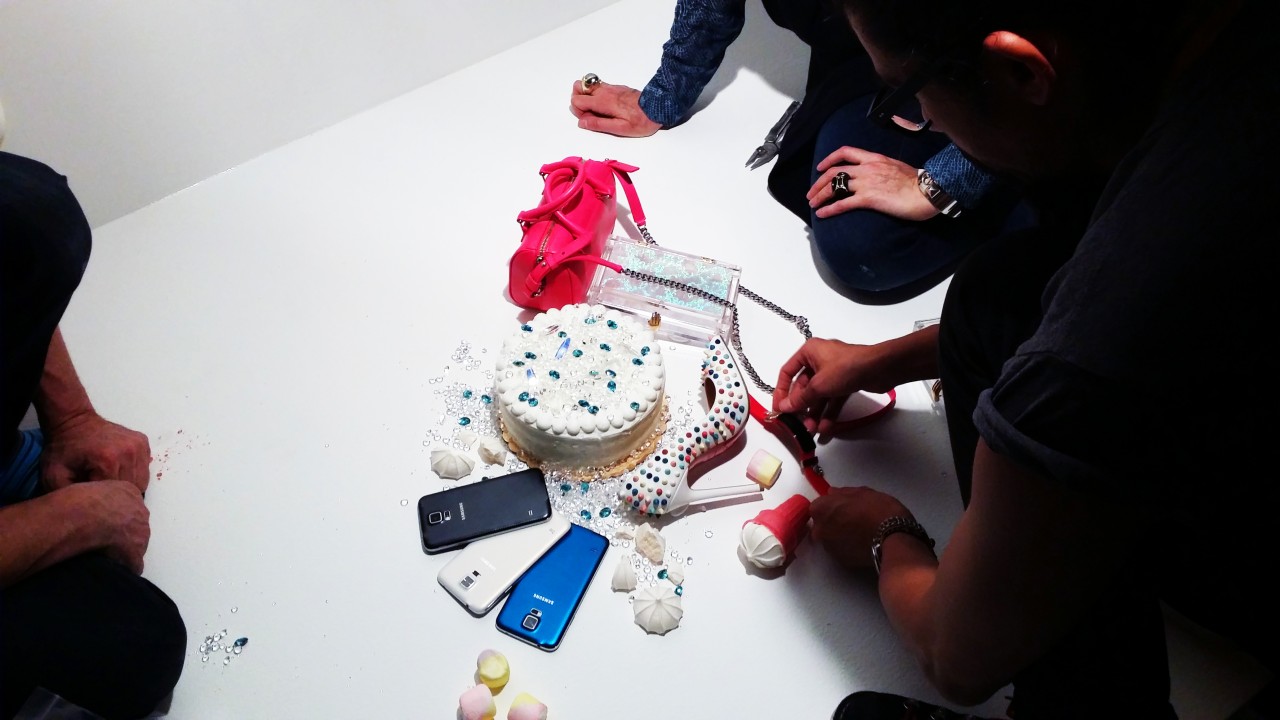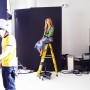 The scenes were positively energetic. Eliza bounced up and down the screen with big smiles and giggles while Sarah decorated her with watches, phones, rings, sunglasses and other colorful accessories. To demonstrate that the phones are water resistant the hairdresser sprayed Eliza from head to toe with water. They both survived. There was a silver bunny, real sponge cakes, painted backdrops and a million flashes. The fun didn’t let up for twelve hours!